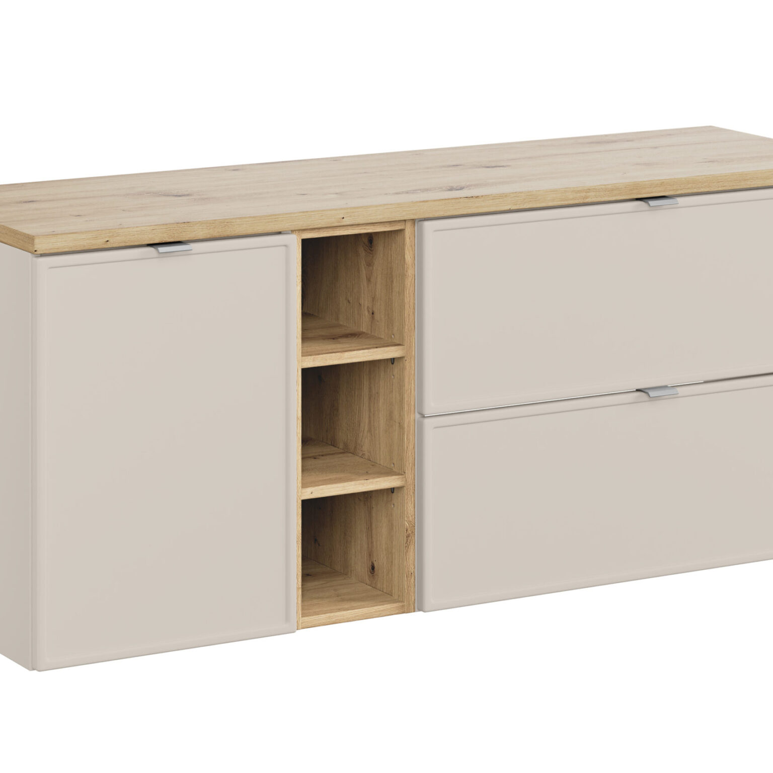 Keskeny helyre ideális a 60–70 cm széles, fiókos mosdószekrény tálmosdóval és fölötte tükrös elemmel. A kasmír front mellé natúr tölgy munka­lap természetes melegséget ad, króm fogantyúval és csapteleppel letisztult lesz az összkép. A falra függesztett magas szekrény alul zárt, felül polcos tárolást biztosít – a törölközők és kozmetikumok kényelmesen elférnek.