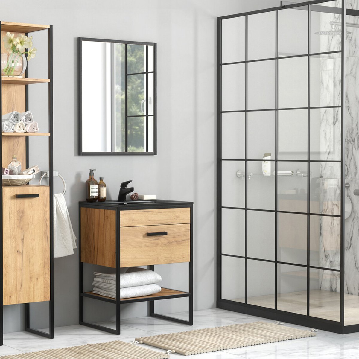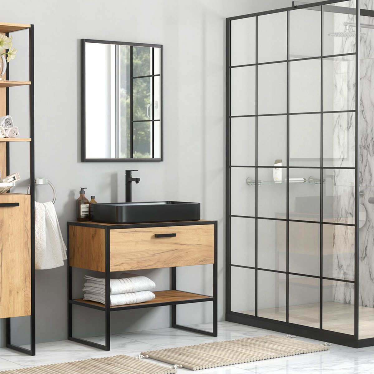 A fém váz porszórt felületű, amely ellenáll a fürdő párájának és a mindennapi használatnak. A bútorlapok könnyen ápolhatók, a matt fekete mosdó pedig a vízkőfoltokkal szemben is hálás választás. Mindegyik elem a tartósságot és az egyszerű tisztíthatóságot helyezi előtérbe – pontosan azt, amire egy fürdőszoba bútor esetén szükség van.