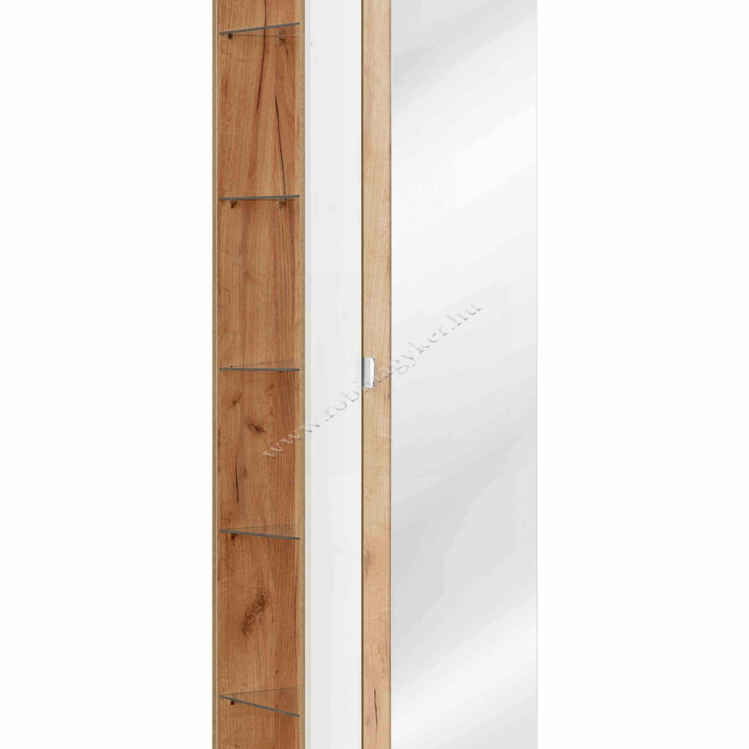 • Magas szekrény: tágas, polcozott belső, csukható tükörbetéttel. Ajtónyitás jobbos/balos irányban állítható.