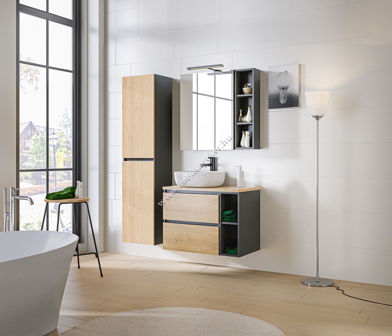 • Könnyű kombinálhatóság: kerek vagy szögletes tükörrel, nyitott polccal, LED világítással.
