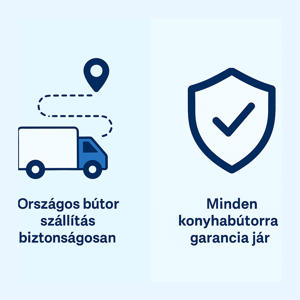 Minden konyhabútor gyártói bútor garancia alatt áll a vonatkozó feltételek szerint. A pántokra és vasalatokra jellemzően külön, hosszabb garancia vonatkozhat. Online rendelésnél a jogszabályi elállási lehetőség és a cserefolyamat egyértelmű: ha kérdésed van, ügyfélszolgálatunk lépésről lépésre segít. Elérhető alkatrészek: pánt, sín, fogantyú, láb, polc, front – így évekkel később is egységes marad a konyhád.
