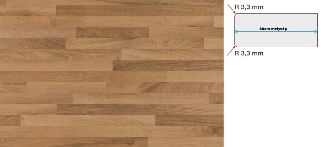 – A munkalap eleje 3,3 mm-es rádiusszal kerekített alul-felül. A munkalap hátsó-egyenes éle normál élfóliázott.