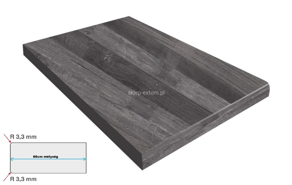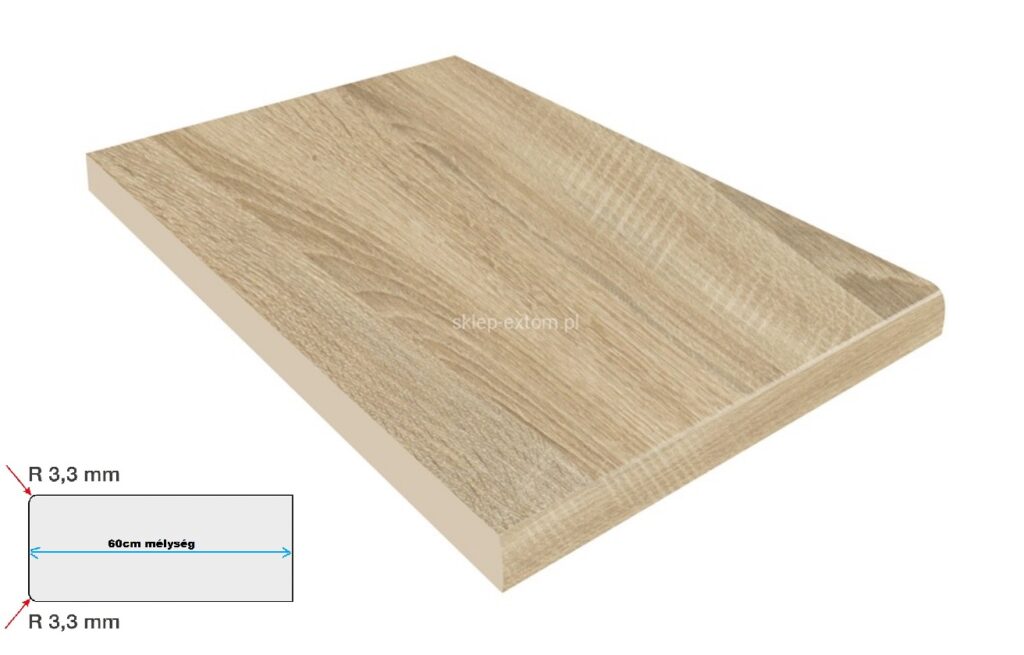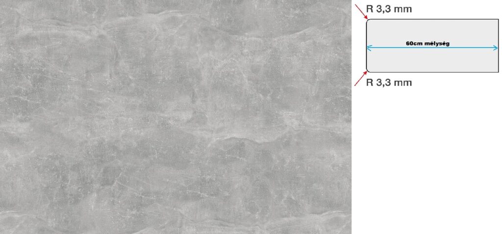 – A munkalap eleje 3,3 mm-es rádiusszal kerekített alul-felül. A munkalap hátsó-egyenes éle normál élfóliázott.