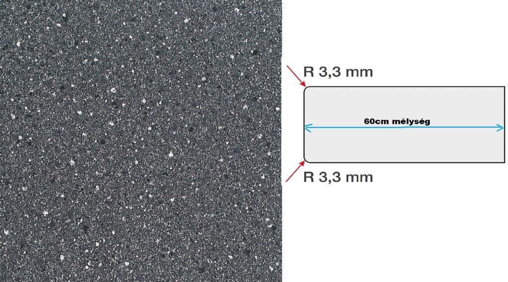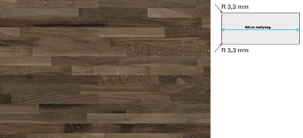 – A munkalap eleje 3,3 mm-es rádiusszal kerekített alul-felül. A munkalap hátsó-egyenes éle normál élfóliázott.