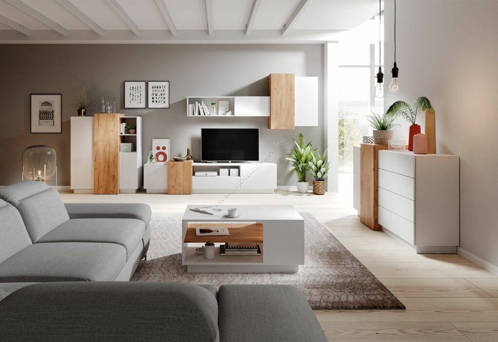 A 3D nappali összeállítás fehér és arany tölgy színben harmonizáló szekrénysor. Geometrikus formák kombinációja növeli a modern hatást. Ellenáll a nedvességnek és a karcolásoknak.