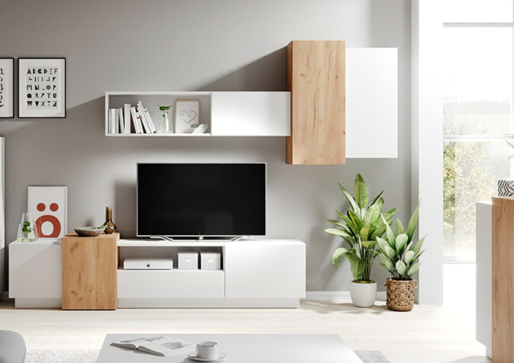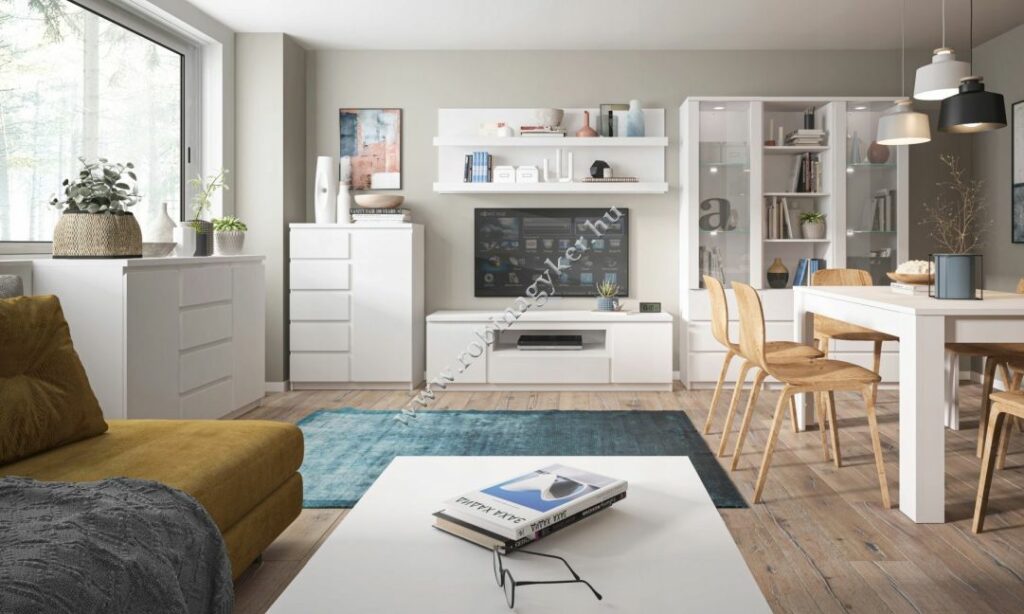 A 3D nappali összeállítás fehér és arany tölgy színben harmonizáló szekrénysor. Geometrikus formák kombinációja növeli a modern hatást. Ellenáll a nedvességnek és a karcolásoknak.