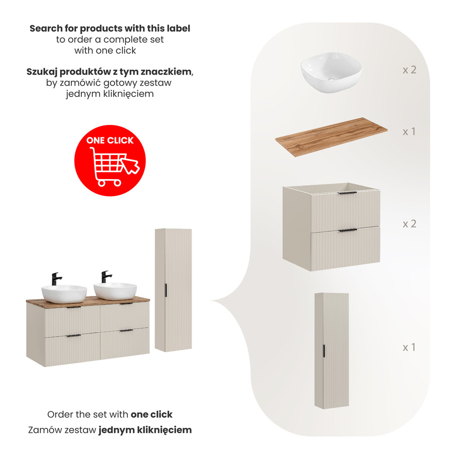A szett központi elemei két mosdószekrény és egy 120 cm-es munkalap, amely tömör anyagból készült, a Wotan tölgy jellegzetes árnyalatában. A teljes szett finom matt kasmír színben készült, amely otthonos és elegáns hangulatot kölcsönöz a fürdőszobának. A bútorfrontokat függőleges mart barázdák díszítik, finom hatást keltve. A bútorfogantyúk három színben kaphatók: fényes arany, matt fekete és fényes króm, így azokat az egyéni esztétikai preferenciákhoz igazíthatja. A szett két pultra szerelhető mosdót is tartalmaz a Smile sorozatból, amelyeket modern dizájn és kiváló minőségű kidolgozás jellemez. Ezenkívül a szett tartalmaz egy magas szekrényt is, amelyben számos nélkülözhetetlen fürdőszobai kiegészítő tárolható.