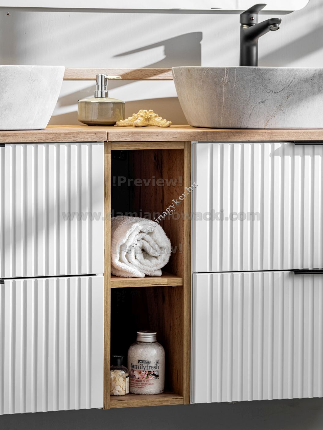 A kollekció 60 cm-es és 80 cm-es méretű mosdókagyló alatti függőszekrényekből, magas szekrényből és 60 cm-es, 80 cm-es és 120 cm-es és 140-es munkalapokból áll, amelyek lehetőséget adnak kisebb-nagyobb összeállítások elkészítésére is.