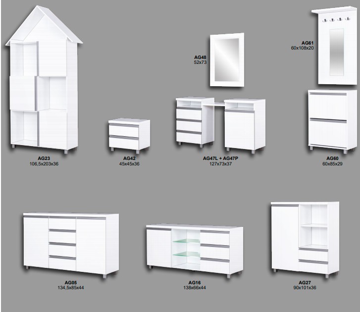 Ezen gyártó legújabb családja a AGA, letisztult skandináv jellegű bútorcsalád. 25 elem közül válogathat mindenki kedvére az igényelt lakóterületre a megfelelő termékek kiválasztásával. Akár felnőtt, akár ifjúsági szoba berendezésére is ajánljuk. A fogantyúk ergonomikus fogást biztosítanak a magas minőségi 16 mm vastag laminált faforgácslapból készült elemek esetén. Az ABS élzárás is a hosszú élettartalmat biztosítja generációról generációra.