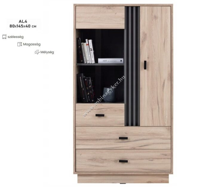 Az összeállítás elemei: AL4 vitrines szekrény 80/145/40cm (szél./mag./mélys.)