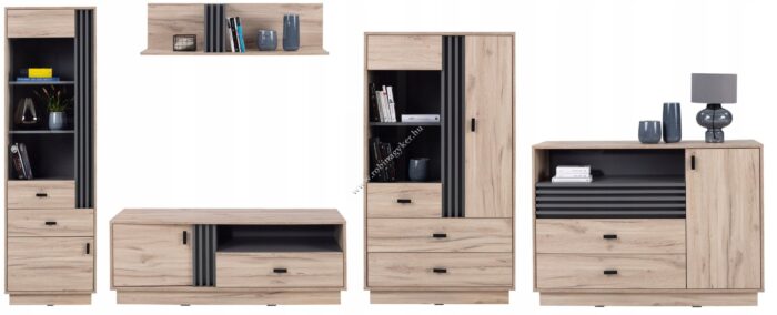 Ezen gyártó legújabb termék családja egyedi ötletekkel és megbízható minőséggel készült azon vásárlók számára akik kedvelik a modern és praktikus bútorokat. Az ALLMO bútor család 14 eleméből lehet válogatni a kívánt összeállítást . Az ALLMO bútorkollekció a legigényesebb vásárlók számára készült. Az ALLMO kollekció olyan elemes bútorokat tartalmaz, amelyek tökéletesek a modern elrendezésekhez, de a klasszikus enteriőrökhöz is. Az ALLMO bútorok a garanciája a gyönyörűen kidolgozott nappalinak, de mindenekelőtt karaktert kölcsönöz neki. Kétségtelen, hogy a faszerű frontok antracit lamella betéttel kombinálva eredeti és modern dizájnt teremtenek a helyiségben. A kollekció fekete fogantyúkkal rendelkezik, amelyek a természetes fa színével kombinálva egy meleg és hangulatos szoba benyomását keltik.