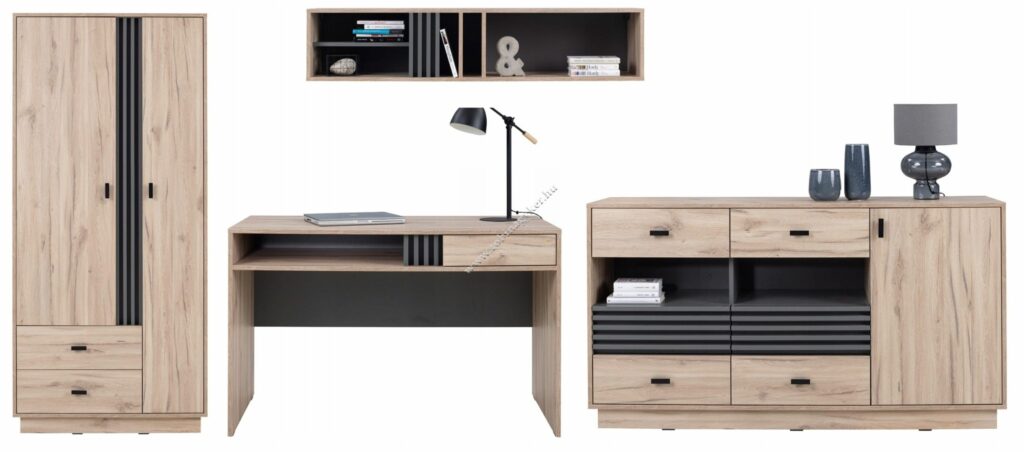 Ezen gyártó legújabb termék családja egyedi ötletekkel és megbízható minőséggel készült azon vásárlók számára akik kedvelik a modern és praktikus bútorokat. Az ALLMO bútor család 14 eleméből lehet válogatni a kívánt összeállítást . Az ALLMO bútorkollekció a legigényesebb vásárlók számára készült. Az ALLMO kollekció olyan elemes bútorokat tartalmaz, amelyek tökéletesek a modern elrendezésekhez, de a klasszikus enteriőrökhöz is. Az ALLMO bútorok a garanciája a gyönyörűen kidolgozott nappalinak, de mindenekelőtt karaktert kölcsönöz neki. Kétségtelen, hogy a faszerű frontok antracit lamella betéttel kombinálva eredeti és modern dizájnt teremtenek a helyiségben. A kollekció fekete fogantyúkkal rendelkezik, amelyek a természetes fa színével kombinálva egy meleg és hangulatos szoba benyomását keltik.