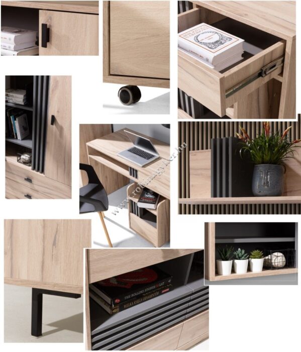 Ezen gyártó legújabb termék családja egyedi ötletekkel és megbízható minőséggel készült azon vásárlók számára akik kedvelik a modern és praktikus bútorokat. Az ALLMO bútor család 14 eleméből lehet válogatni a kívánt összeállítást . Az ALLMO bútorkollekció a legigényesebb vásárlók számára készült. Az ALLMO kollekció olyan elemes bútorokat tartalmaz, amelyek tökéletesek a modern elrendezésekhez, de a klasszikus enteriőrökhöz is. Az ALLMO bútorok a garanciája a gyönyörűen kidolgozott nappalinak, de mindenekelőtt karaktert kölcsönöz neki. Kétségtelen, hogy a faszerű frontok antracit lamella betéttel kombinálva eredeti és modern dizájnt teremtenek a helyiségben. A kollekció fekete fogantyúkkal rendelkezik, amelyek a természetes fa színével kombinálva egy meleg és hangulatos szoba benyomását keltik.