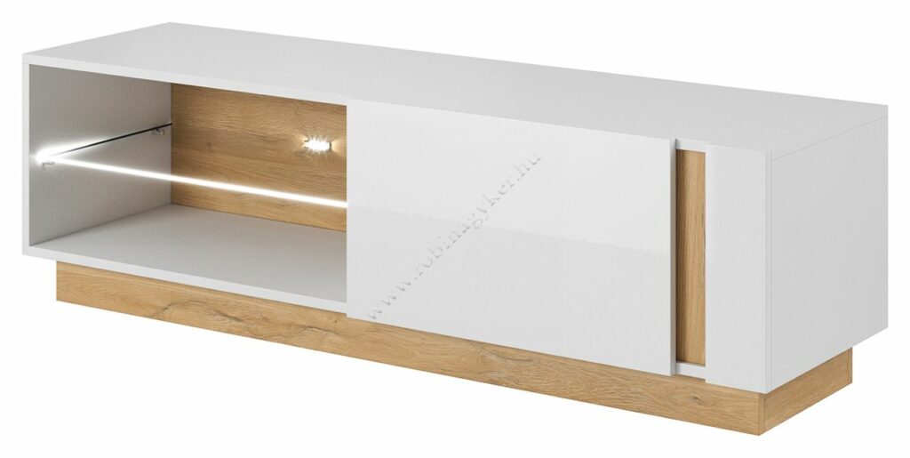Az Arco bútorkollekció három tónusú, matt és fényes fehér eredeti kombinációja grandson tölgy dekorációval. Sok daraból álló bútorcsalád többek között: komódok, éjjeliszekrények, dohányzóasztal, ágy, gardróbszekrények, TV szekrények, vitrinek és fali polc. Ezeket a modelleket modern dizájn jellemzi, amit a geometrikus vonal és a fogantyú nélküli előlap biztosít. A világos tónusok miatt a Laski bútorai kis helyiségben is jól mutatnak, általuk a nappali stílusossá válik. A bútorok minőségi laminált faforgács bútorlapból készülnek, ellenállnak a mechanikai sérüléseknek. A gyártó a korpuszokat speciális ABS szegéllyel rögzíti. Érdemes megjegyezni, hogy belső tereik nagyon tágasak. Számos szekrény, fiók és polc segíti a dolgok tárolását és a rend fenntartását. További előny a fogantyú nélküli előlapok, amelyek garantálják a szekrények és fiókok könnyű nyitását és zárását (PUSH-TO-OPEN ajtó nyitó rendszer).