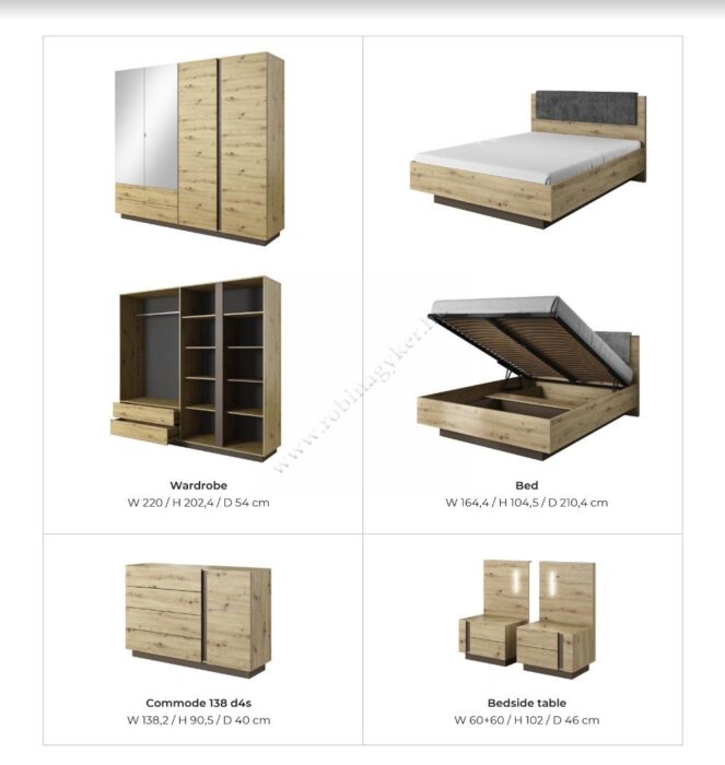 Az Arco bútorkollekció két tónusú, artisan tölgy grafit dekorációval. Sok daraból álló bútorcsalád többek között: komódok, éjjeliszekrények, dohányzóasztal, ágy, gardróbszekrények, TV szekrények, vitrinek és fali polc. Ezeket a modelleket modern dizájn jellemzi, amit a geometrikus vonal és a fogantyú nélküli előlap biztosít. A Laski bútorai kis helyiségben is jól mutatnak, általuk a hálószoba stílusossá válik. A bútorok minőségi laminált faforgács bútorlapból készülnek, ellenállnak a mechanikai sérüléseknek. A gyártó a korpuszokat speciális ABS szegéllyel rögzíti. Érdemes megjegyezni, hogy belső tereik nagyon tágasak. Számos szekrény, fiók és polc segíti a dolgok tárolását és a rend fenntartását. További előny a fogantyú nélküli előlapok, amelyek garantálják a szekrények és fiókok könnyű nyitását és zárását (PUSH-TO-OPEN ajtó nyitó rendszer).