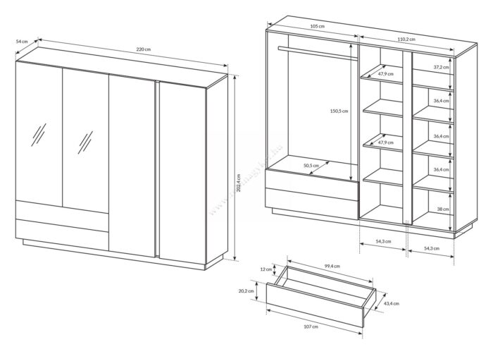 Szélesség: 220 cm Magasság: 202,4 cm Mélység: 54 cm