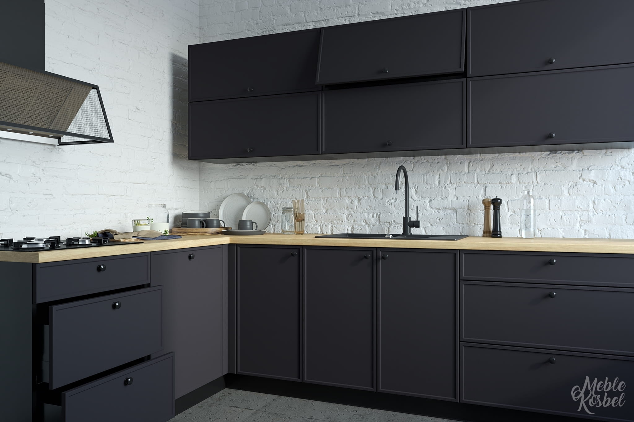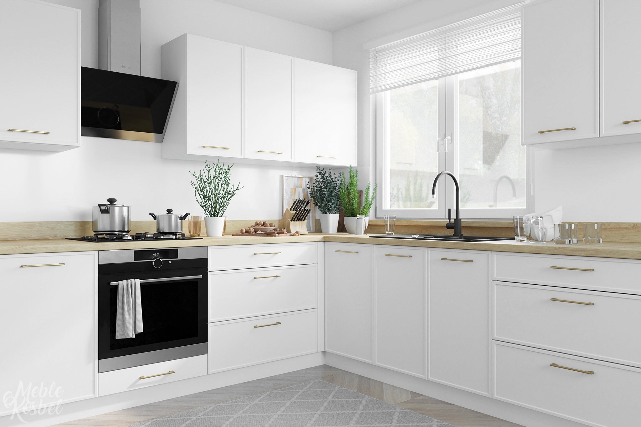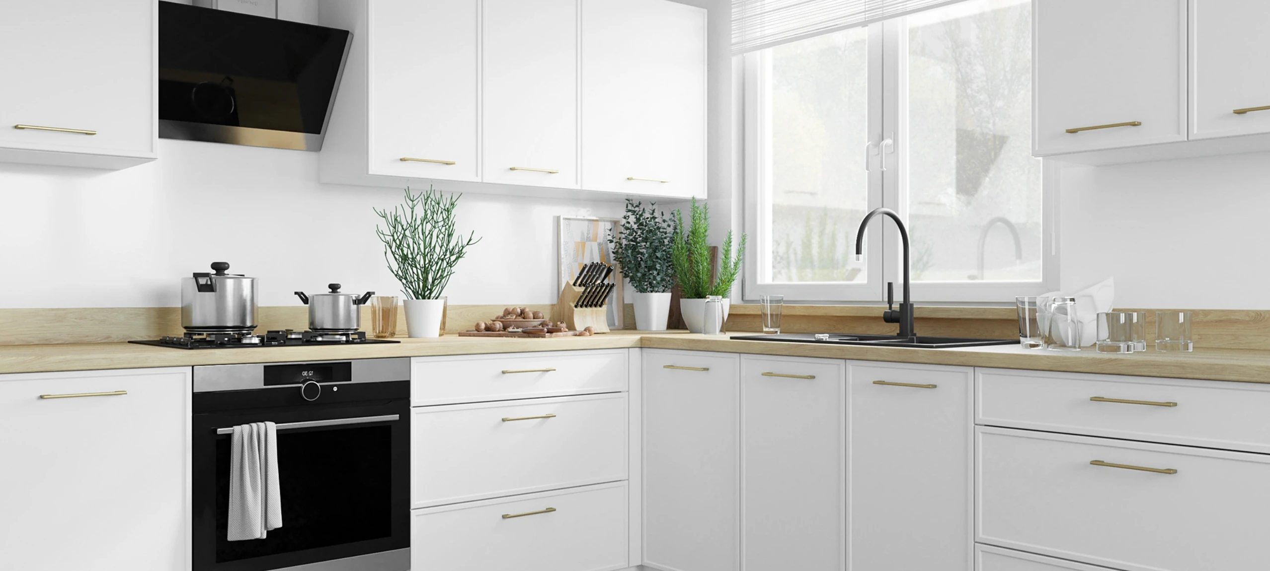 A fehér sarokváltozat különösen jó választás lehet kisebb vagy közepes méretű terekbe. A világos front, a természetes fa munkalap és a fekete csaptelep együtt friss, modern, tiszta hatást kelt. Ilyen összeállításnál a konyhabútor vizuálisan kevésbé terheli a teret, ezért a helyiség nagyobbnak és levegősebbnek tűnhet.