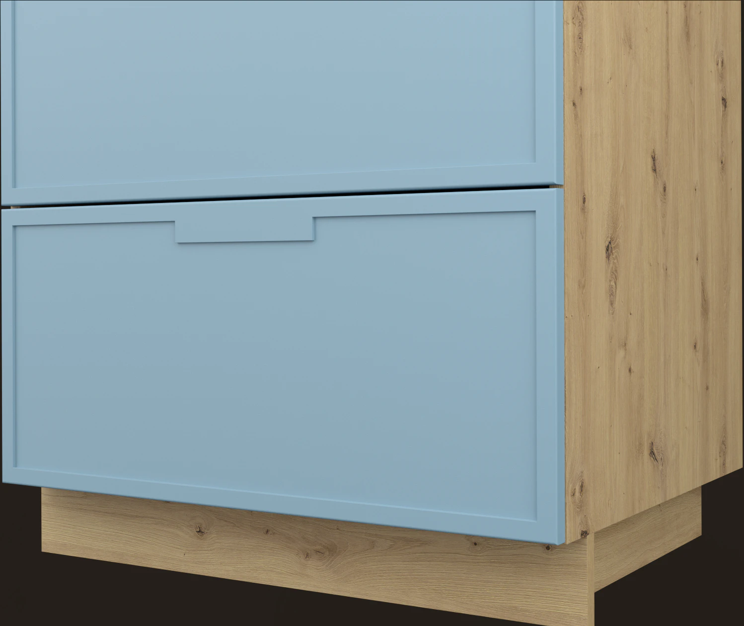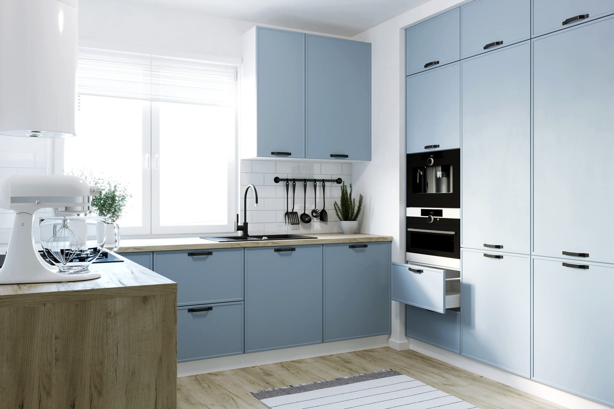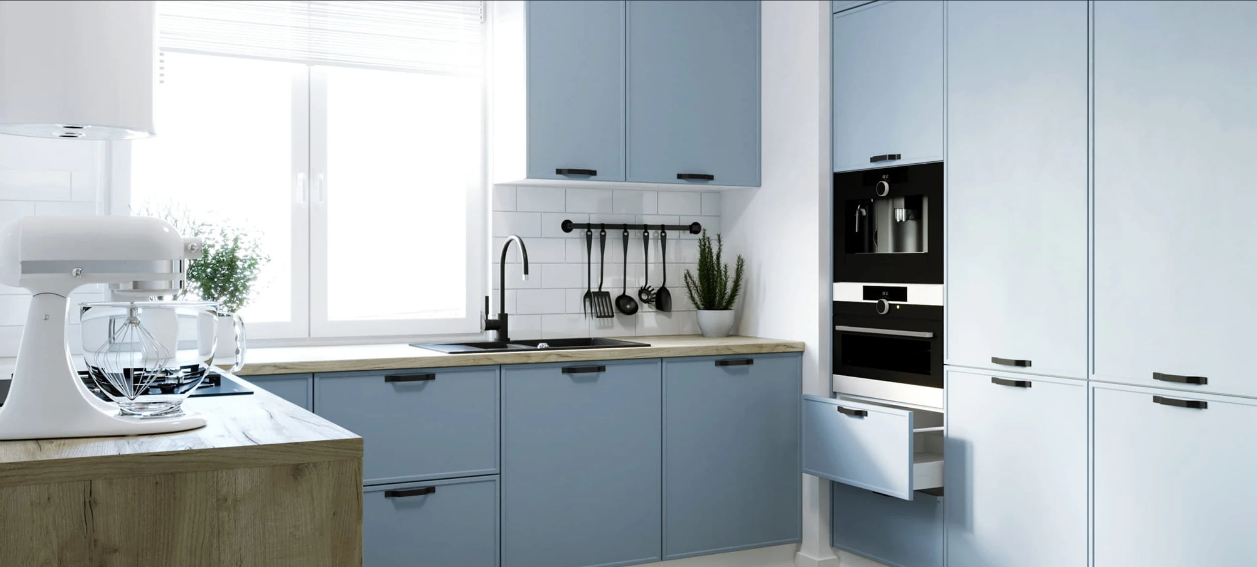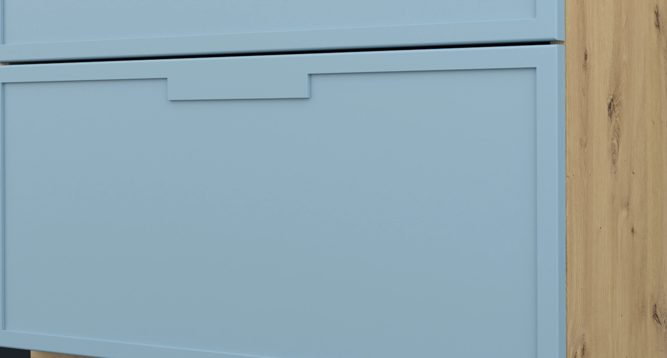 A halványkék verzió más karaktert hoz. A képek alapján puhább, otthonosabb, kissé skandináv irányú hangulatot képvisel. A világos fa oldallap és a fekete fogantyúk jól ellenpontozzák a frontok színét, ettől a rendszer egyszerre marad lágy és modern. Ez a megoldás azoknak lehet különösen érdekes, akik valami egyedit szeretnének, de nem túl harsányat.