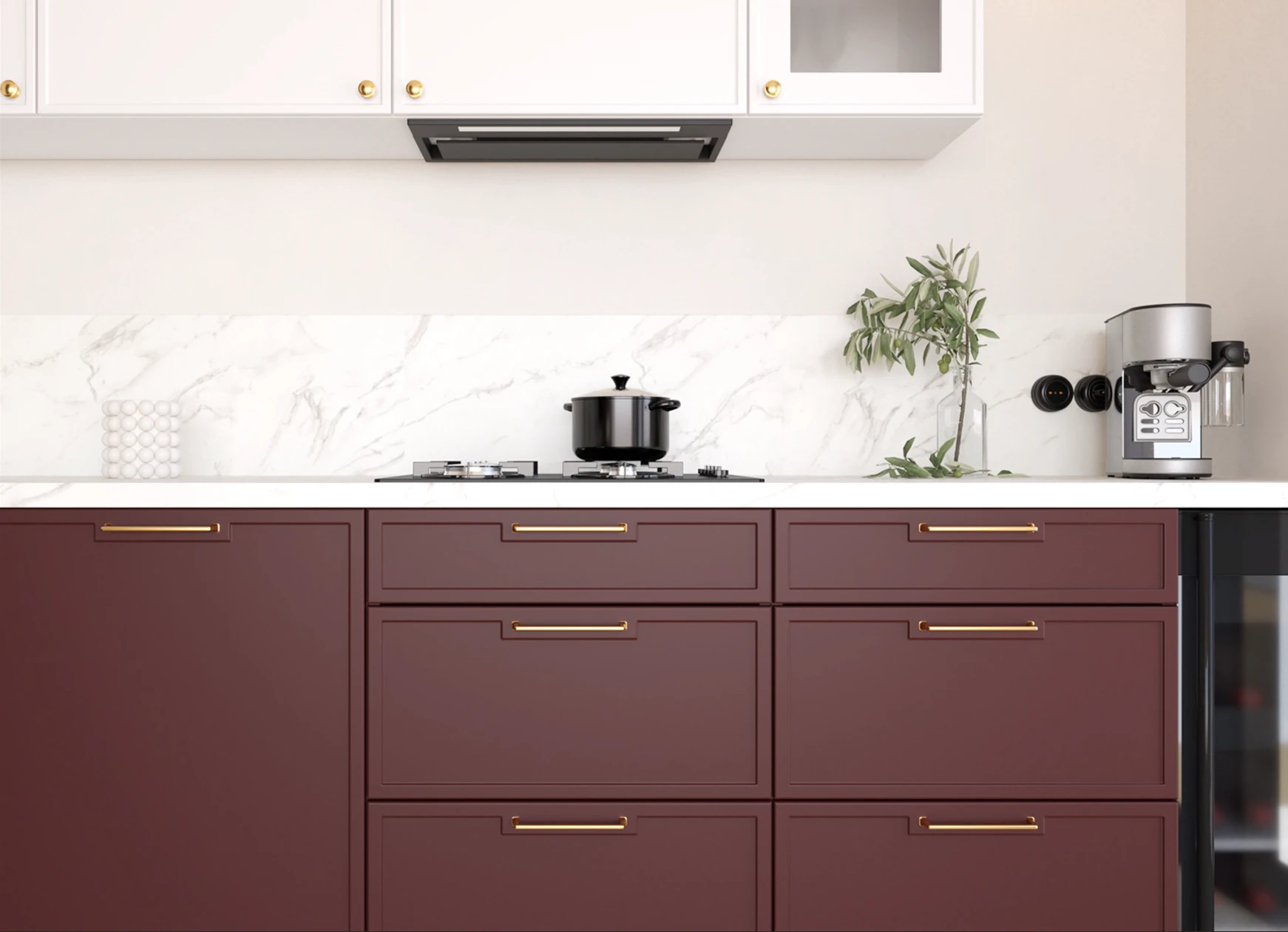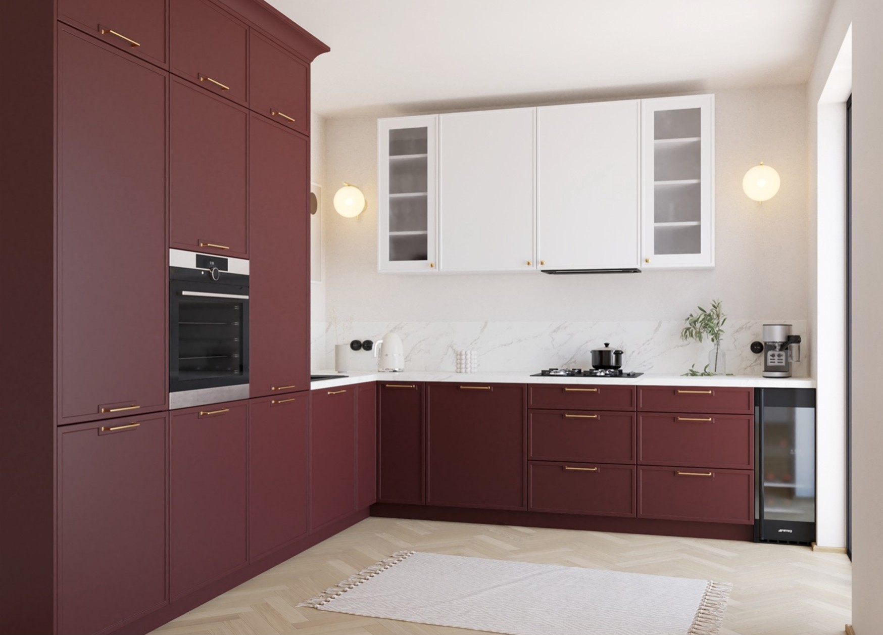 A bordó és mély vörösesbarna árnyalatú képek prémiumabb, kifinomultabb hangulatot sugallnak. Fehér felső elemekkel, márványhatású háttérrel és arany tónusú fogantyúkkal az összkép sokkal elegánsabb, reprezentatívabb lesz. Ez a stílus azoknak tetszhet, akik a modern forma mellé szeretnének egy kis melegséget és luxusérzetet is vinni a térbe.
