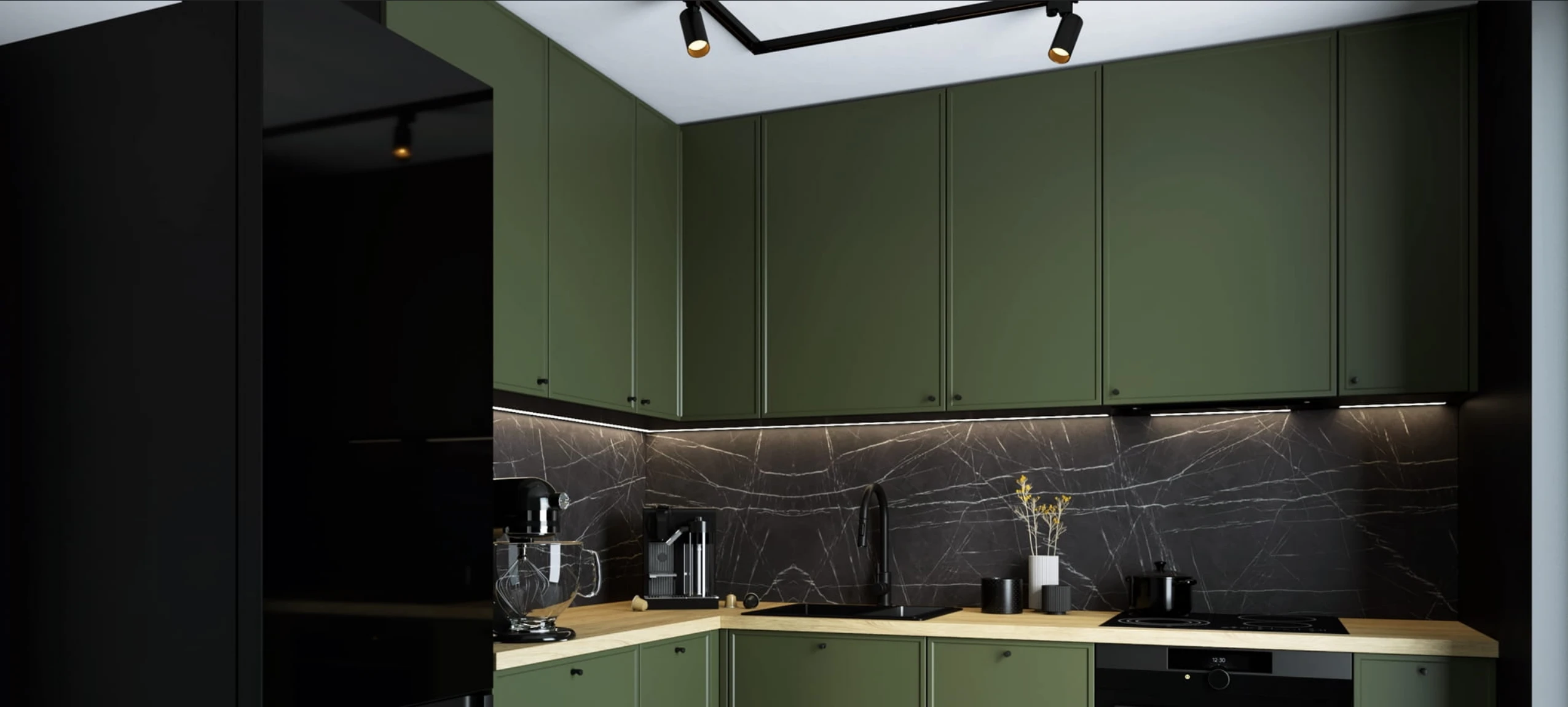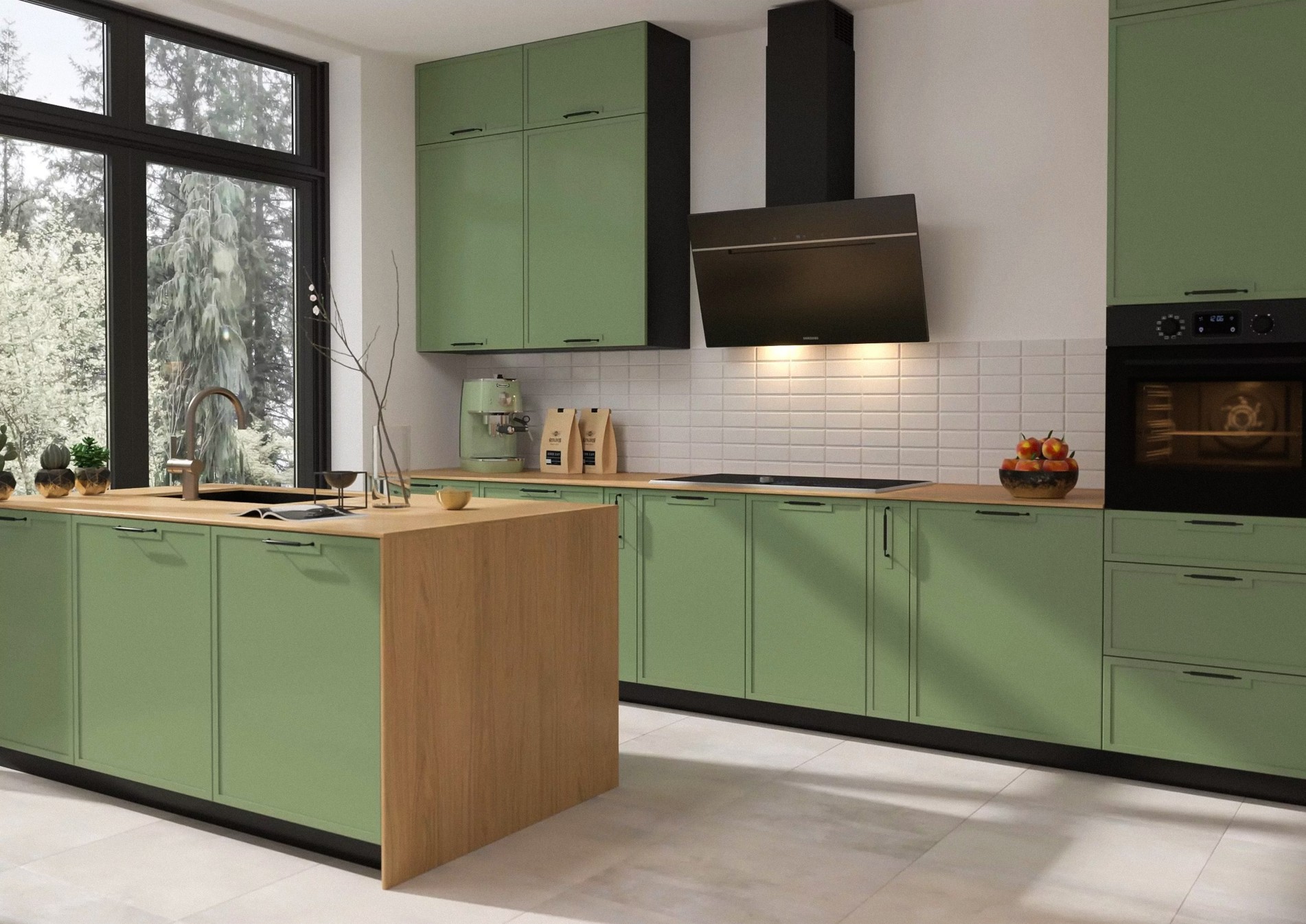 A zöld, szigetes összeállítás pedig kifejezetten látványos példája annak, hogy az AREZZO nemcsak kisebb lakásokban, hanem tágasabb, nagyobb belsőépítészeti koncepcióban is jól működik. A fekete lábazat, a fa szigetoldal és a fehér hátfal együtt kiegyensúlyozott, mai megjelenést hoznak létre.