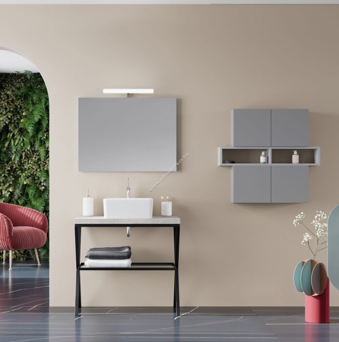 A függesztett mosdós szekrények: szintén hőfóliázott MDF anyagúak és fedőlap nélkül vagy fedővel ellátott bútordarabok sokoldalúak és praktikusak. A „Made in Italy” teljesen kinyitható és csendes csukódású belső fiók, valamint a front teljes hosszában tartó hangsúlyos, krómozott fémfogantyú tartósságot és pontos záródást garantál.