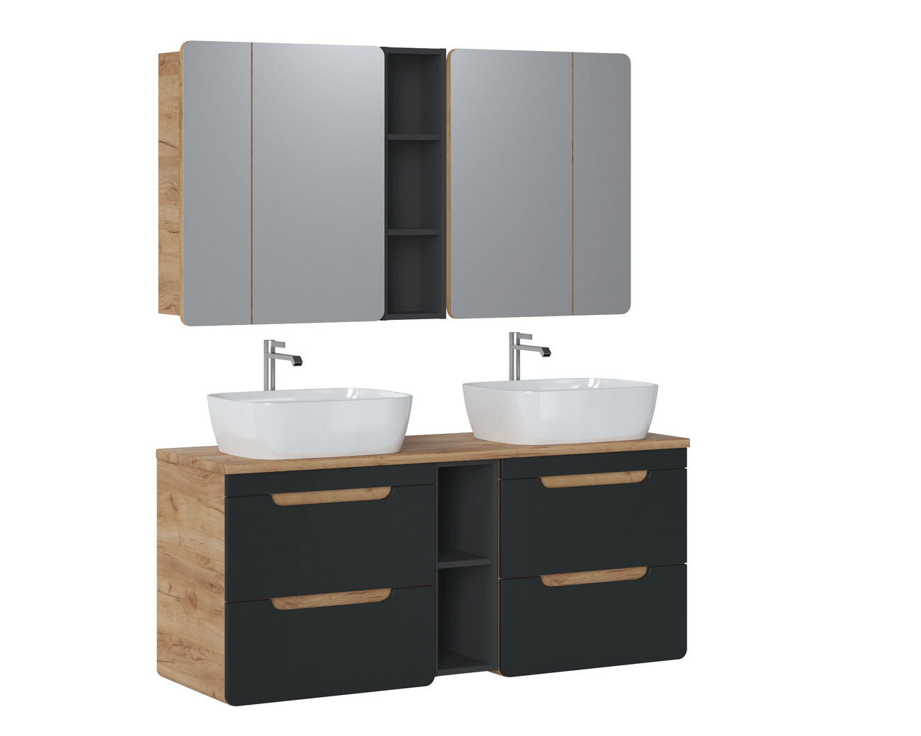Az Aruba egy egyedülálló kollekció, amely könnyed és modern dizájnjával rabul ejti a tekintetet. A fa színű szekrények fekete előlapokkal kombinálva finom egészet alkotnak, trópusi spa hangulattal. Minden szekrény lekerekített élei egyedi karaktert és könnyedséget kölcsönöznek a kollekciónak, míg a fogantyú nélküli előlapok a legújabb lakberendezési trendeket tükrözik. A kollekció alacsony és magas szekrényekből áll, különböző változatokban, így személyre szabott és egyedi szettet hozhat létre. Kétségtelenül egy rendkívül divatos megoldás a pultra szerelhető mosdószekrény. A LED-es megvilágítású tükör tökéletesen kiegészíti a sorozatot, modern jelleget kölcsönözve az egész kollekciónak. Az Aruba kollekció mindazok számára vonzó lesz, akik egyedi és modern megoldásokat keresnek fürdőszobájukba.