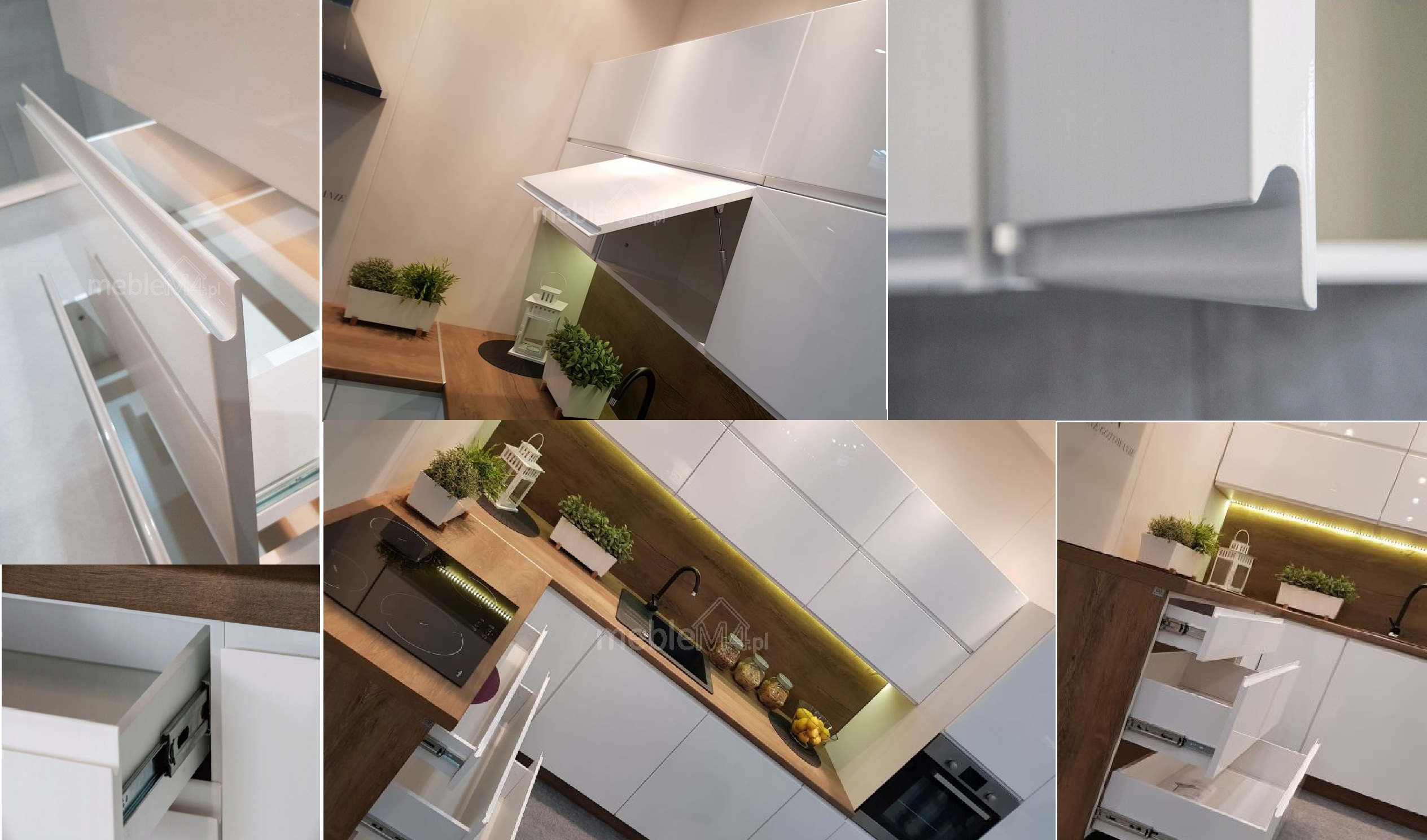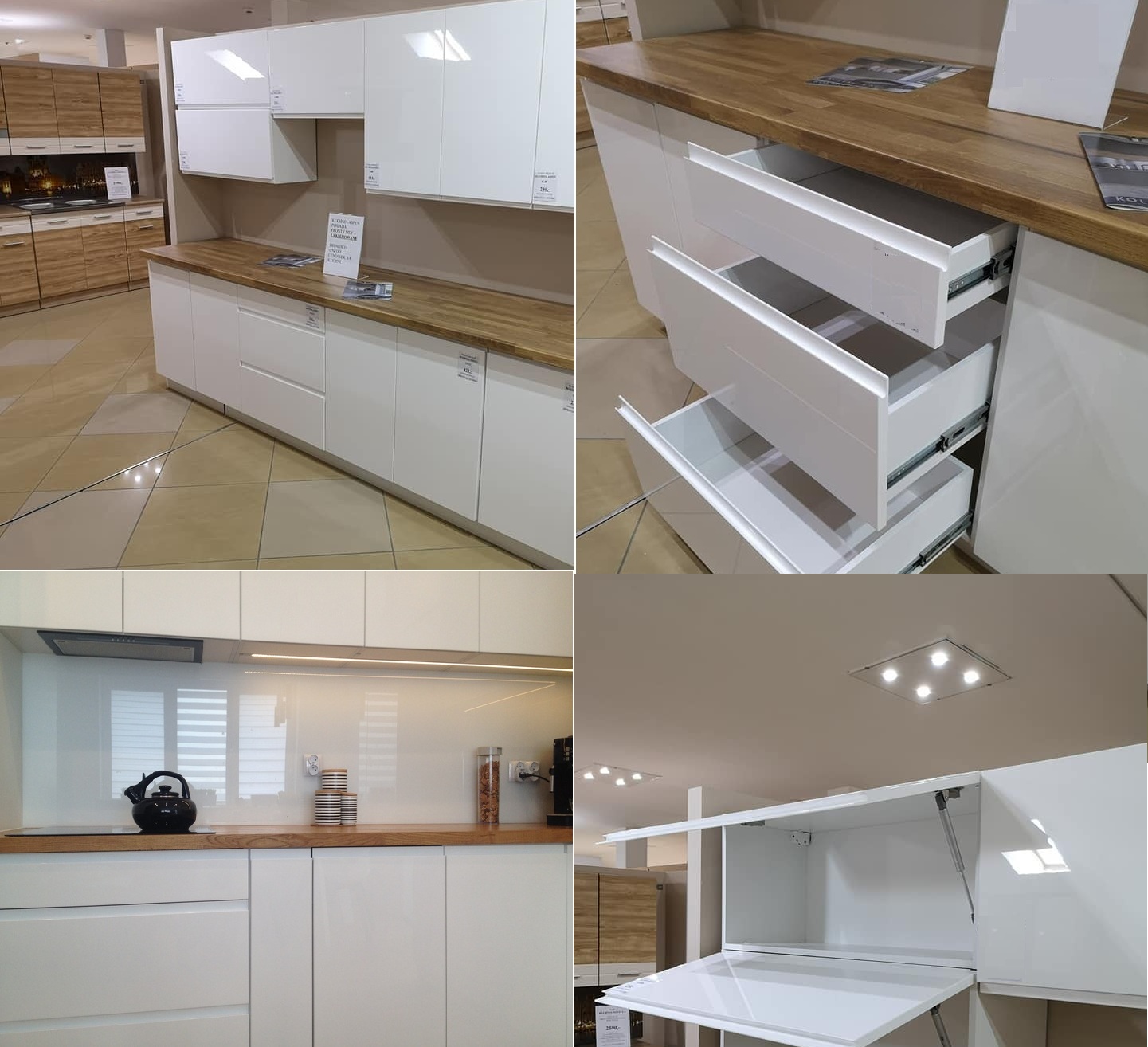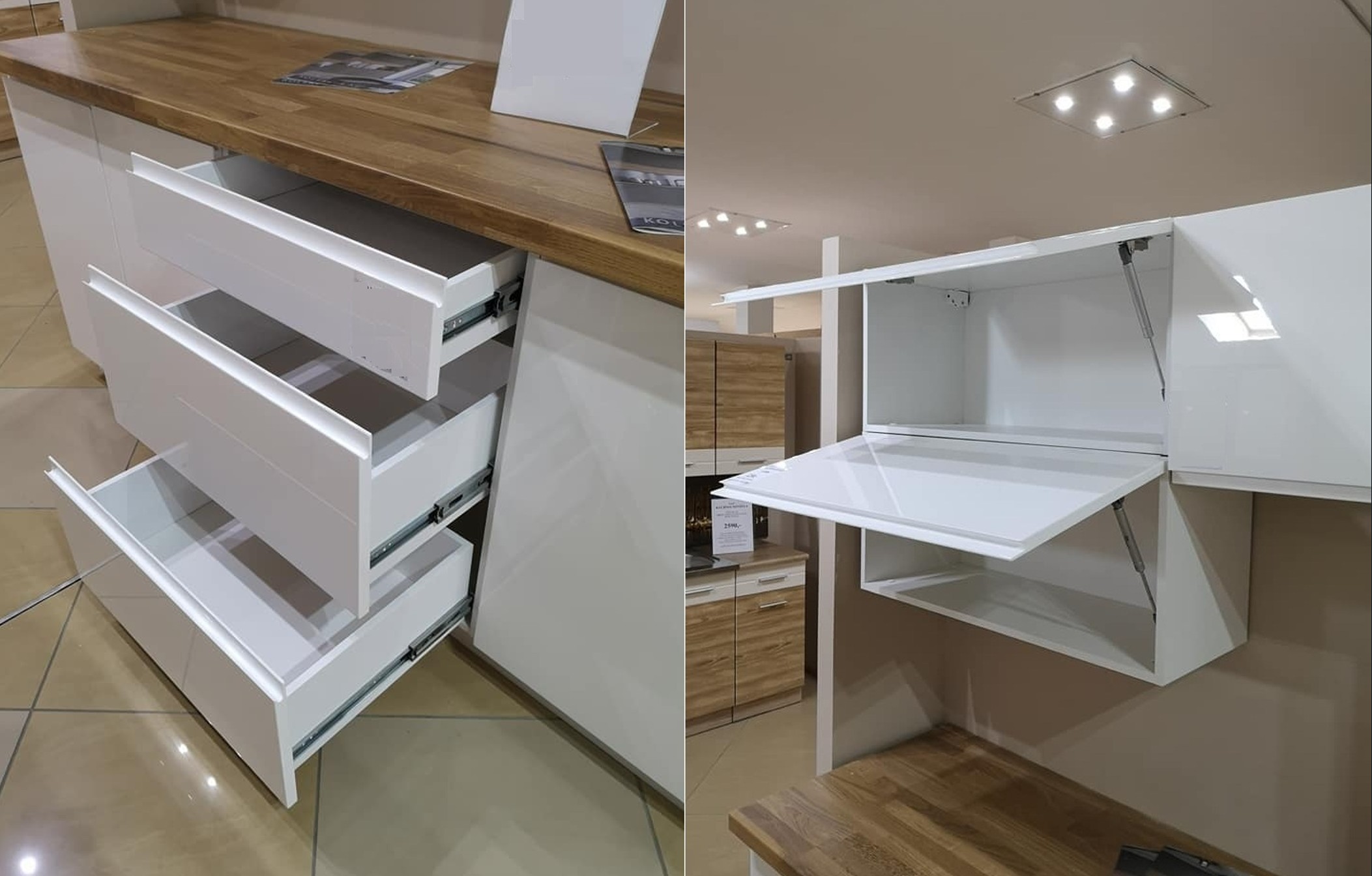 Kollázs az ASPEN fehér magasfényű elemes konyhabútor praktikus megoldásairól: több fiókos, kihúzható alsó egység fa munkalappal, valamint felnyíló (liftes) felső szekrény nyitott állapotban.