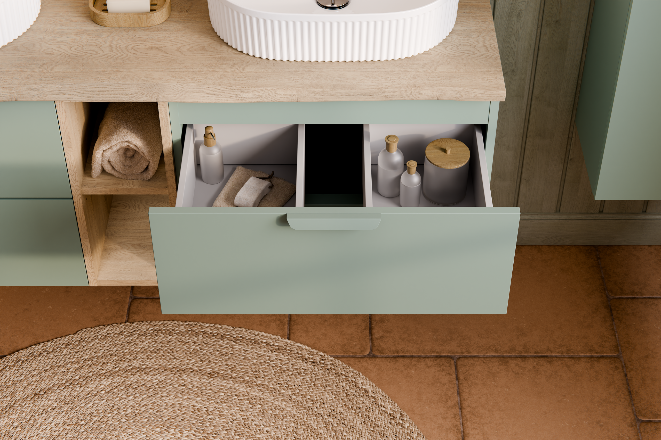 Aster Green esetén a zöld frontokat érdemes kiegyensúlyozni világosabb fal- és pultfelületekkel. Így a bútor hangsúlyos marad, mégsem lesz túl “súlyos” a látvány. Ha a mosdótál pultra ültetett, akkor a pult mélysége és a csaptelep helye is tervezést igényel: kényelmes legyen a kézmosás, és ne fröccsenjen a víz a falra.