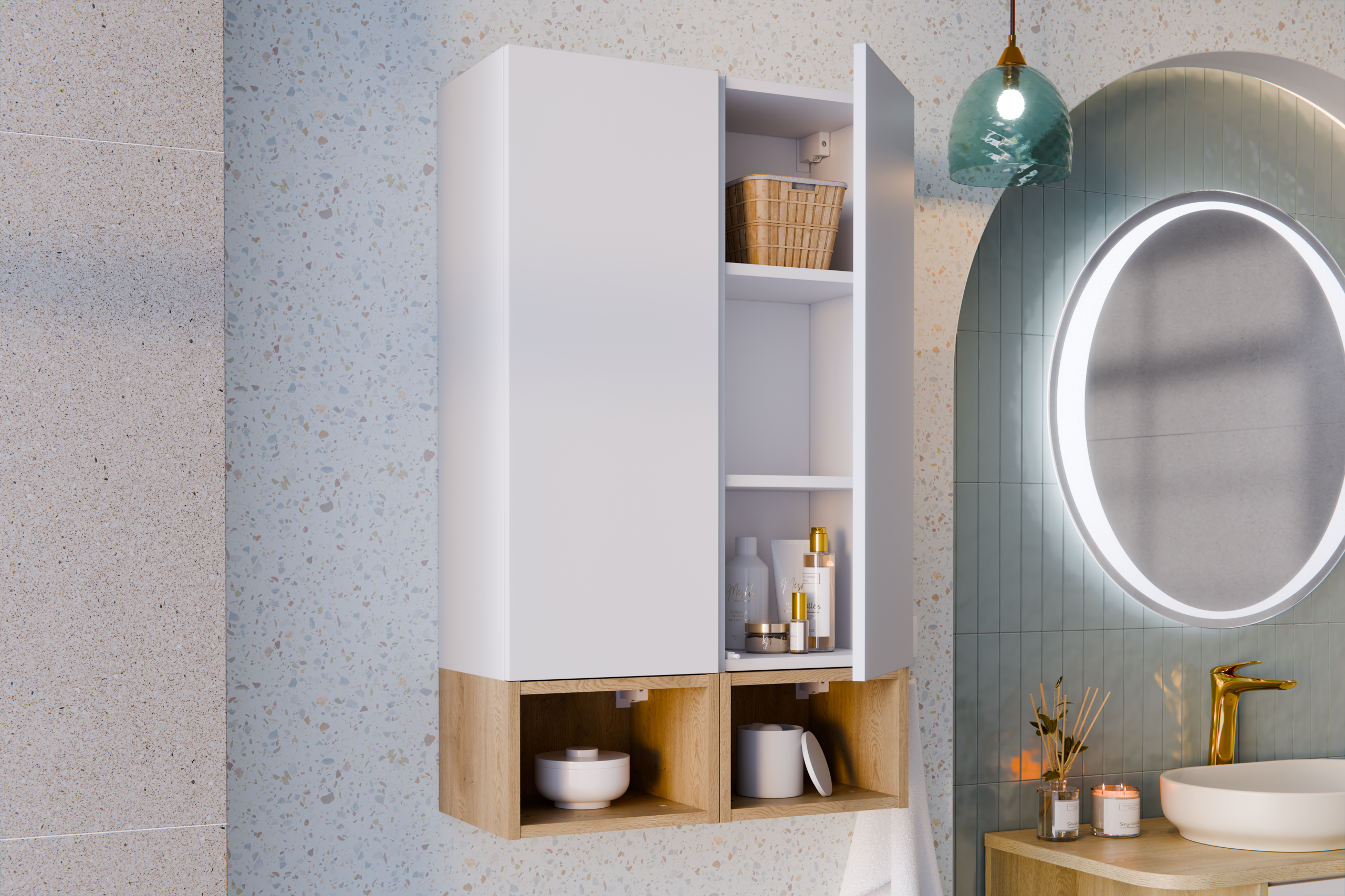 Az elemes fürdőszoba bútor gondolkodás legnagyobb előnye a szabadság. Ha például a lefolyó kiállása, az ablak magassága, a radiátor vagy egy ferde fal korlátoz, akkor a modulokkal „kikerülheted” a problémát. A kollekcióban jól kombinálhatók a zárt frontos elemek a nyitott polcos részekkel: így egyszerre tudsz elrejteni és megmutatni (dekor, illatok, textil).