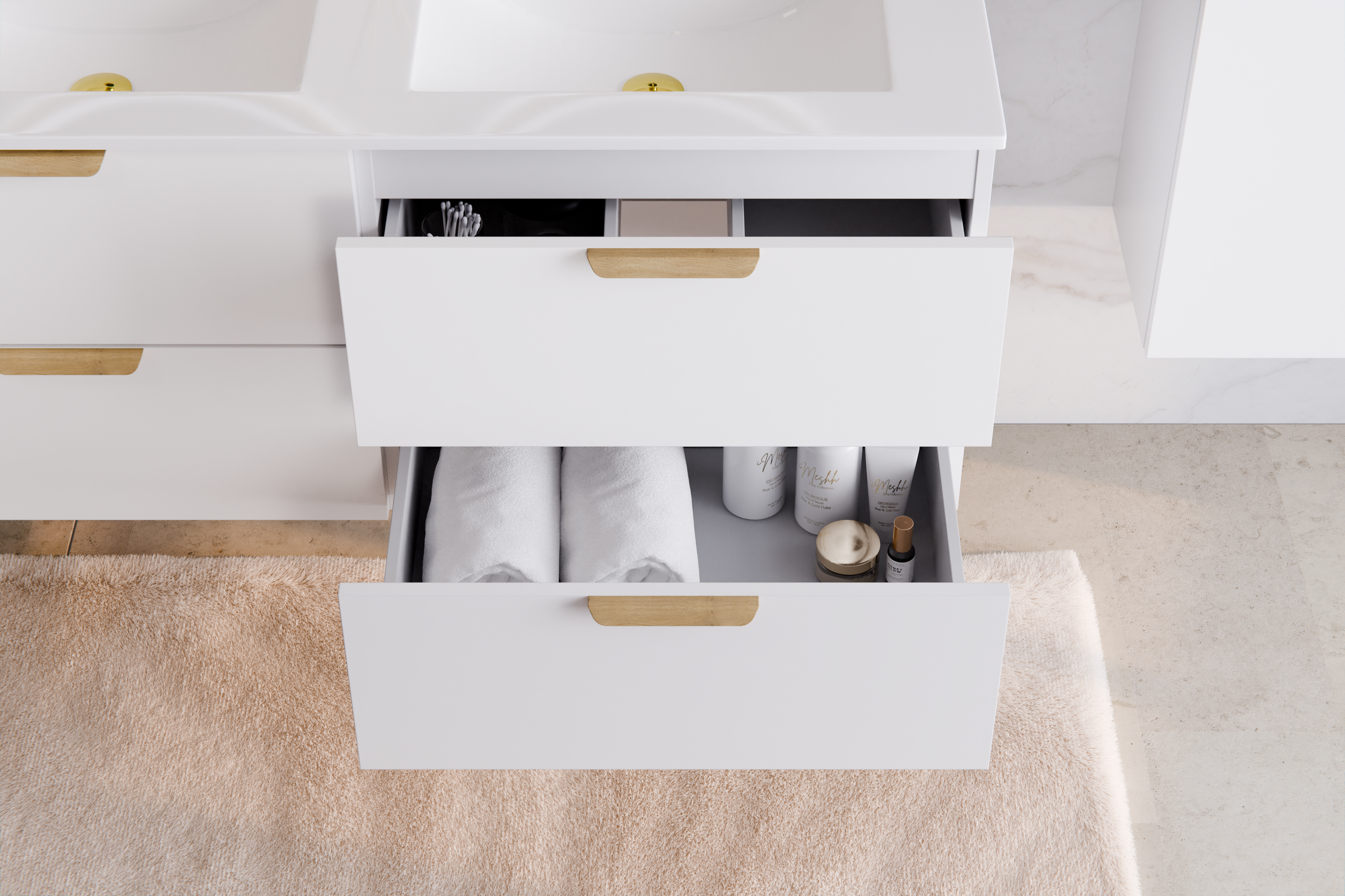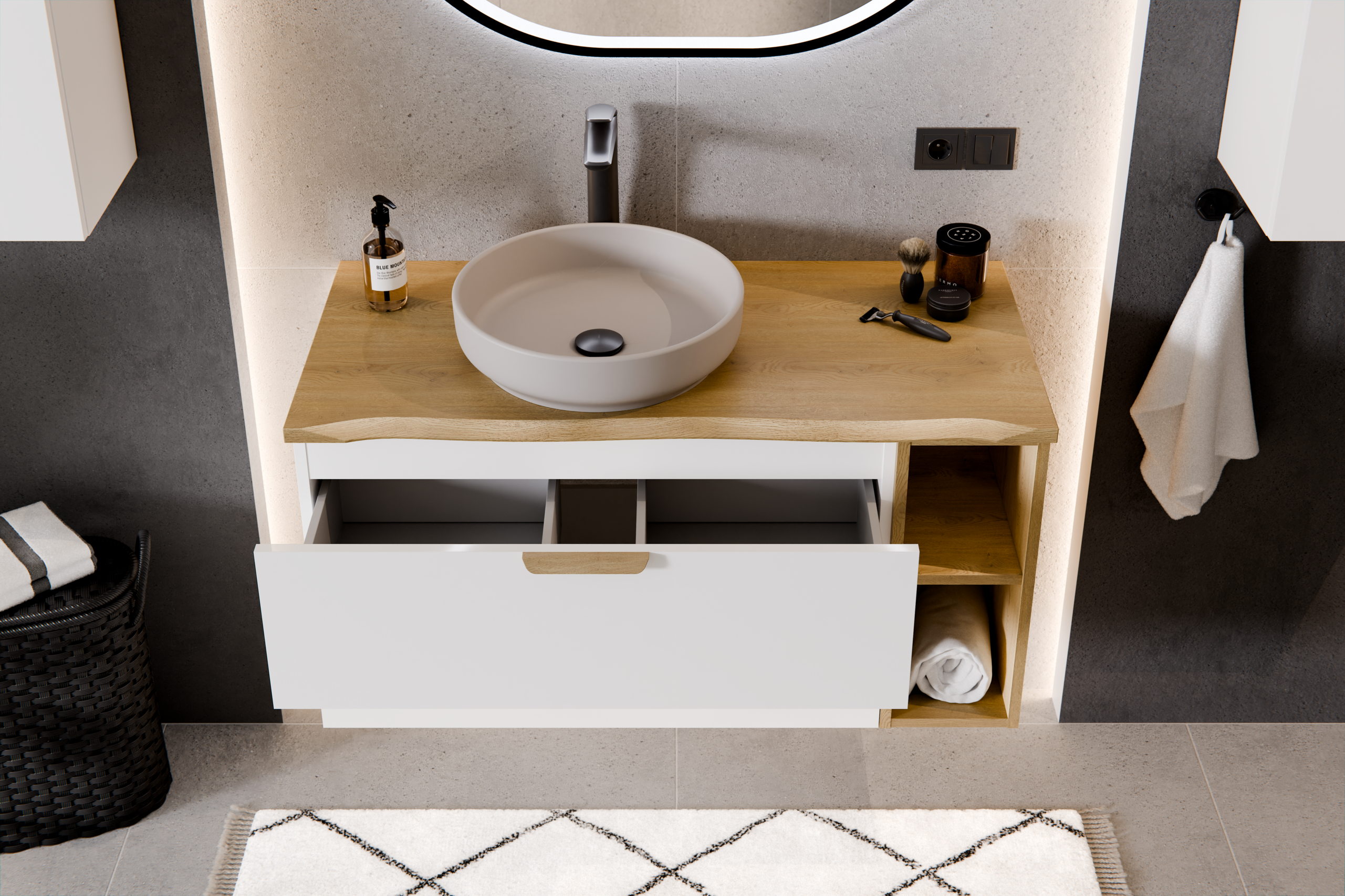 A modern fürdőszoba bútor akkor működik igazán, ha a dizájn és a használhatóság összhangban van. Aster White esetén a fiókos kialakítás az egyik legnagyobb erősség: a fiókban jól rendszerezhető a napi rutin (hajápolás, borotválkozás, smink, gyógyszerek), és a felülről átlátható pakolás időt spórol. A nyitott oldalsó polcok további pluszt adnak: a gyakran használt textil vagy dekor egy mozdulattal elérhető, miközben a zárt részben rend marad. Ez a kombináció a „hotel-fürdő” hangulat egyik titka.