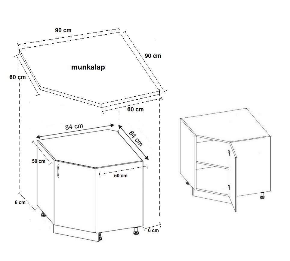A sarok elem beépítési mérete a munkalap tekintetében 90 x 90 cm!!
