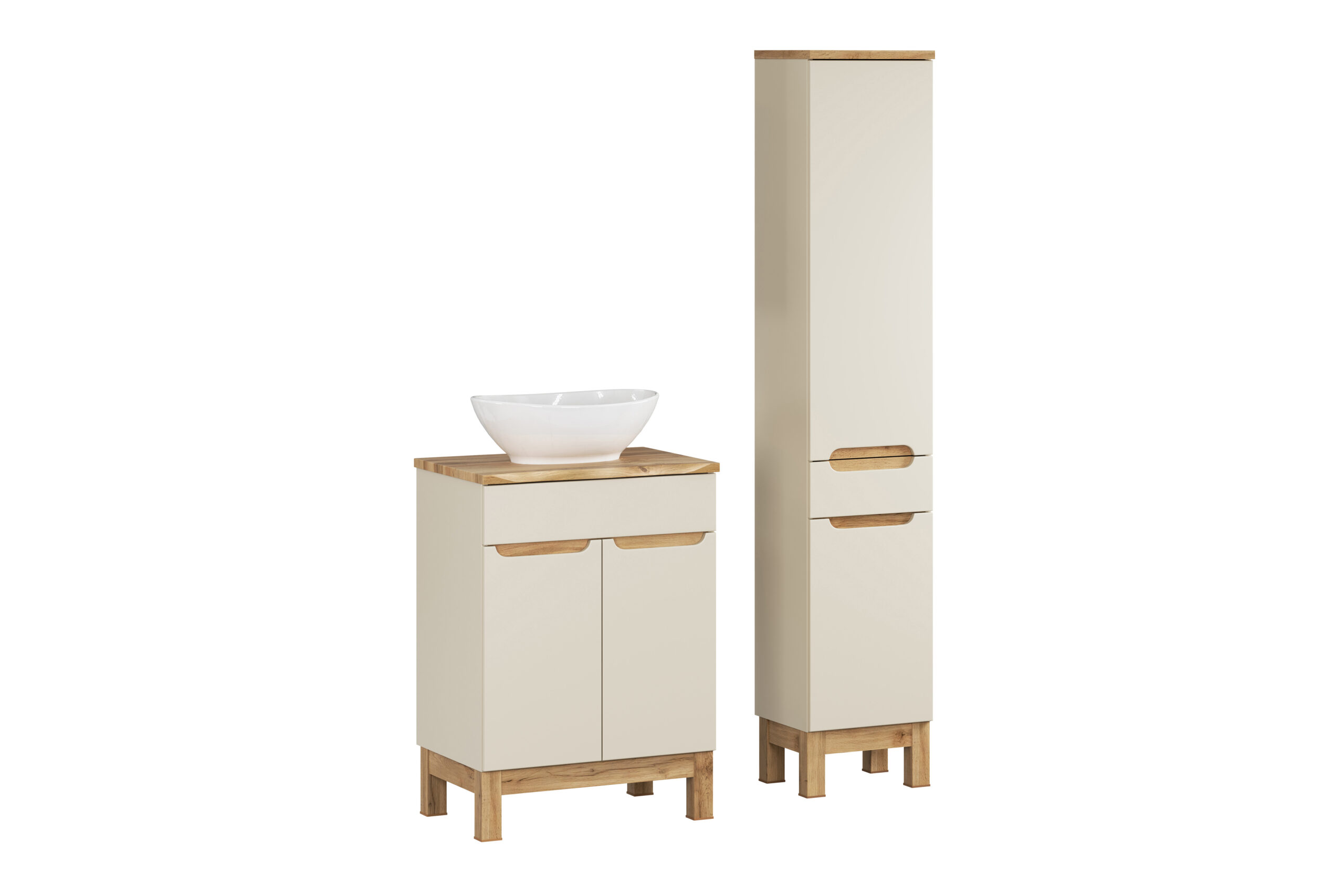 Prémium BALI KASMIR komplett fürdőszoba bútor összeállítás. Matt kasmír bézs frontok, világos tölgy (Wotan tölgy jellegű) munkalap és betétek – harmonikus, modern, otthonos hatás, nem túlzó látványbútor, hanem normál lakásba való inspiráló 2026 stílus. A szekrények praktikus tárolórekeszekkel, fiókokkal, tükrös elemmel, magas szekrénnyel érhetők el. A csaptelep és/vagy szifon jellemzően nem része az alapcsomagnak.