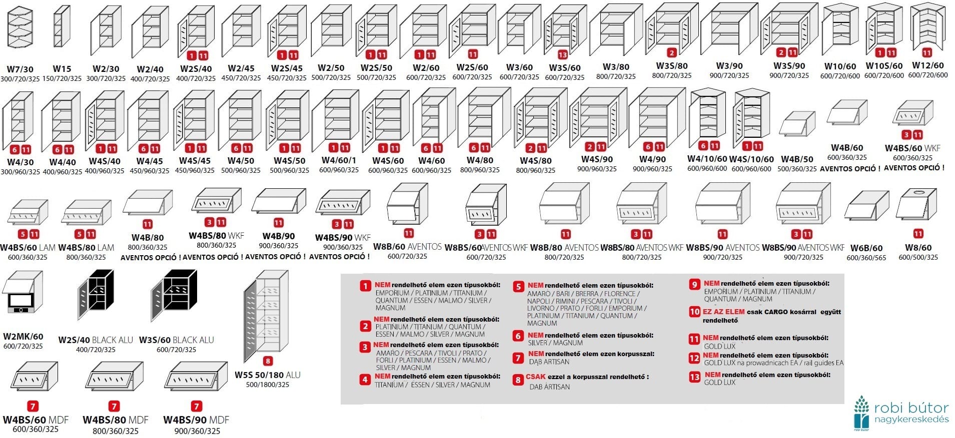 – Rendelhető kiegészítők: munkalap, munkalap összekötők/-fordítók/-végzárók, mosogató medence, csaptelep, külön fogantyúk, világítás, evőeszköz tartó az evőeszközös fiókba, felső elemek felrögzítéséhez fali szerelő sín. Ezen termékek rendelési feltételeiről minden esetben ügyfélszolgálatunkon, vagy a robi@robinagyker.hu E-mail címen tud felvilágosítást kérni.