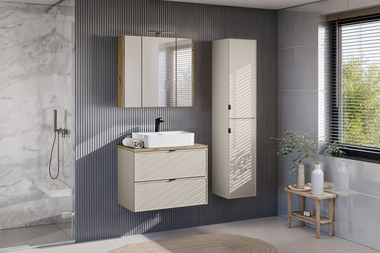 A BELLA KASMIR fürdőszoba bútor kollekciót azoknak ajánljuk, akik egyszerre keresnek modern megjelenést, időtálló minőséget és valódi funkcionalitást. A kasmír bézs árnyalat meleg, otthonos és elegáns – egyszerűen illeszthető világos márványhatású burkolatokhoz, betonhatású csempéhez vagy natúr tölgy dekorhoz is. Nem rideg, nem steril fehér, hanem az a lágy tónus, amit most minden modern fürdőszobás Pinterest fotón látni. A hornyolt MDF frontok prémium hatásúak, nem sima „lapos dobozok”, hanem struktúrált, dekoratív felületek, amik azonnal feldobják a teret akkor is, ha maga a helyiség kicsi.
