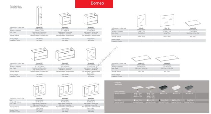 A Borneo kollekció modern és funkcionális fürdőszobabútorok sora, amely tökéletesen ötvözi a sötétszürke testeket a fa színű betétekkel. A kollekció négy méretű mosdószekrényt tartalmaz. A sorozat tartalmaz még egy magas szekrényt, egy alacsony szekrényt szennyeskosárral és a mosdó alatti szekrényekkel kompatibilis méretű tükrös szekrényeket. Az ajtók és fiókok lágyan záródó rendszerrel és fa fogantyúkkal vannak felszerelve. A Borneo egyedi dizájnnal és jól megválasztott színekkel rendelkező fürdőszobabútor kollekció.