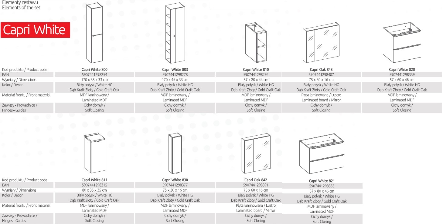 A CAPRI WHITE kollekció egyediségének alapja elsősorban az egyszerű és visszafogott forma kombinációja a gyönyörű dekorációval, amely lehetővé teszi a harmonikus, elegáns belső kialakítást. A bútorok geometriai alakját az élfogantyúk hangsúlyozzák. A kollekció számos elemet tartalmaz. A kényelmet a fiókokban használt csendes zárás funkcióval ellátott vezetők és zsanérok növelik, amelyeknek köszönhetően csendesen és finoman záródnak.