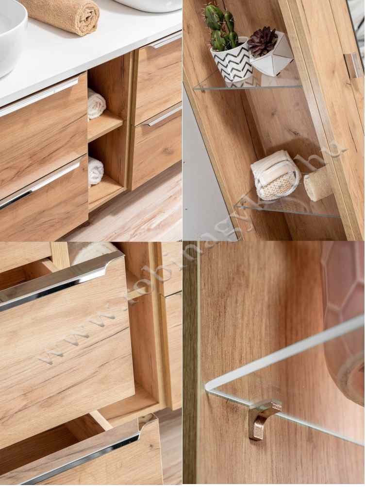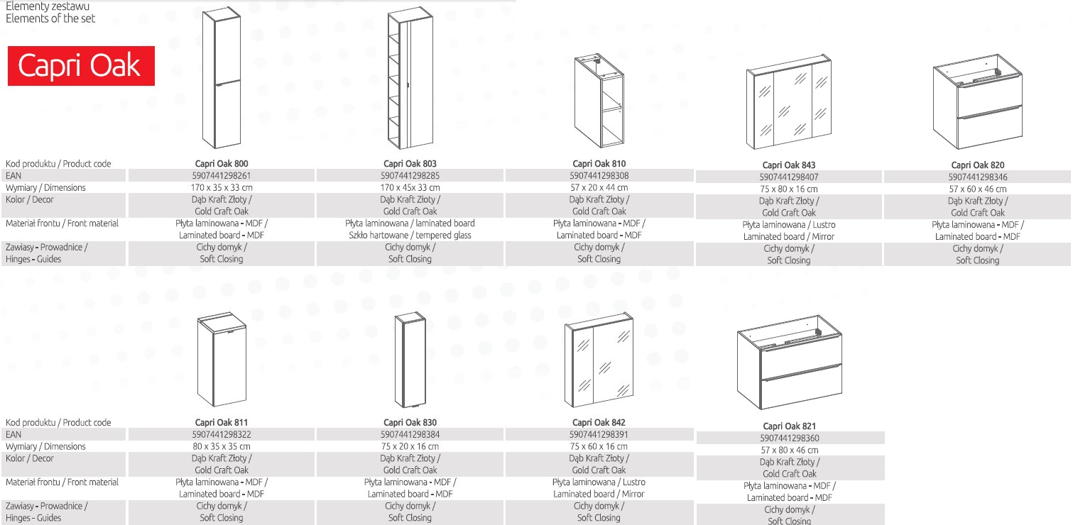 A CAPRI OAK kollekció egyediségének alapja elsősorban az egyszerű és visszafogott forma kombinációja a gyönyörű dekorációval, amely lehetővé teszi a harmonikus, elegáns belső kialakítást. A bútorok geometriai alakját az élfogantyúk hangsúlyozzák. A kollekció számos elemet tartalmaz. A kényelmet a fiókokban használt csendes zárás funkcióval ellátott vezetők és zsanérok növelik, amelyeknek köszönhetően csendesen és finoman záródnak.
