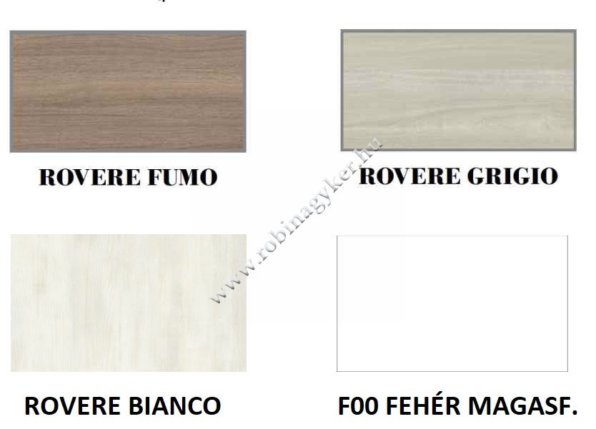 ROVERE FUMO vagy ROVERE GRIGIO vagy ROVERE BIANCO vagy F00 FEHÉR MAGASFÉNYŰ.