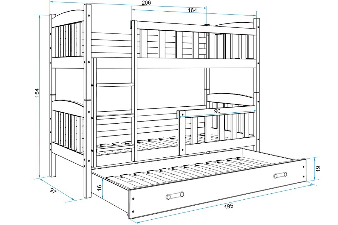 Az ágy stabil, biztonságos és kényelmes fekhelyet biztosít a gyermek számára. Váza minőségi fenyőből készül. Elemeit három réteg festékkel vonják be, mely egészségre ártalmatlan, szagtalan, vízbázisú festék. Az élek lekerekítettek. Az ágy előlapja jobbos illetve balos állásban is felszerelhető, ettől függően az alsó leesés gátló is lehet jobb vagy baloldalon, mely könnyen leszerelhető, ha már nincs rá szükség. A létra is kerülhet jobb illetve bal oldalra is. Az ágyrács lécek bükk fából készülnek. Az ágy alsó részében könnyen hozzáférhető, kerekeken gördülő fiók található.