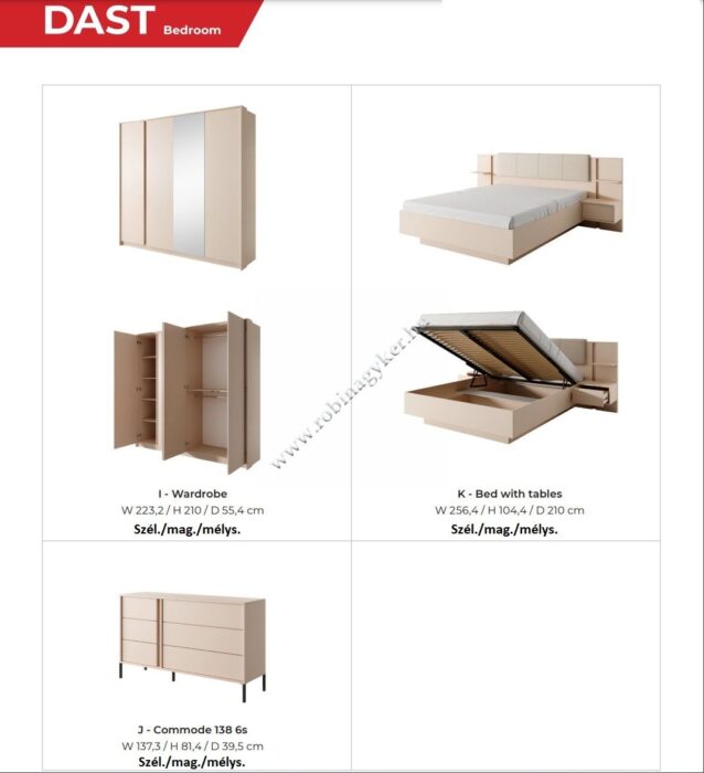 A modern Dast hálószoba összeállítás kiváló minőségű 16 mm-es laminált lapból készül, ellenáll a nedvességnek, a karcolásoknak és a magas hőmérsékletnek.