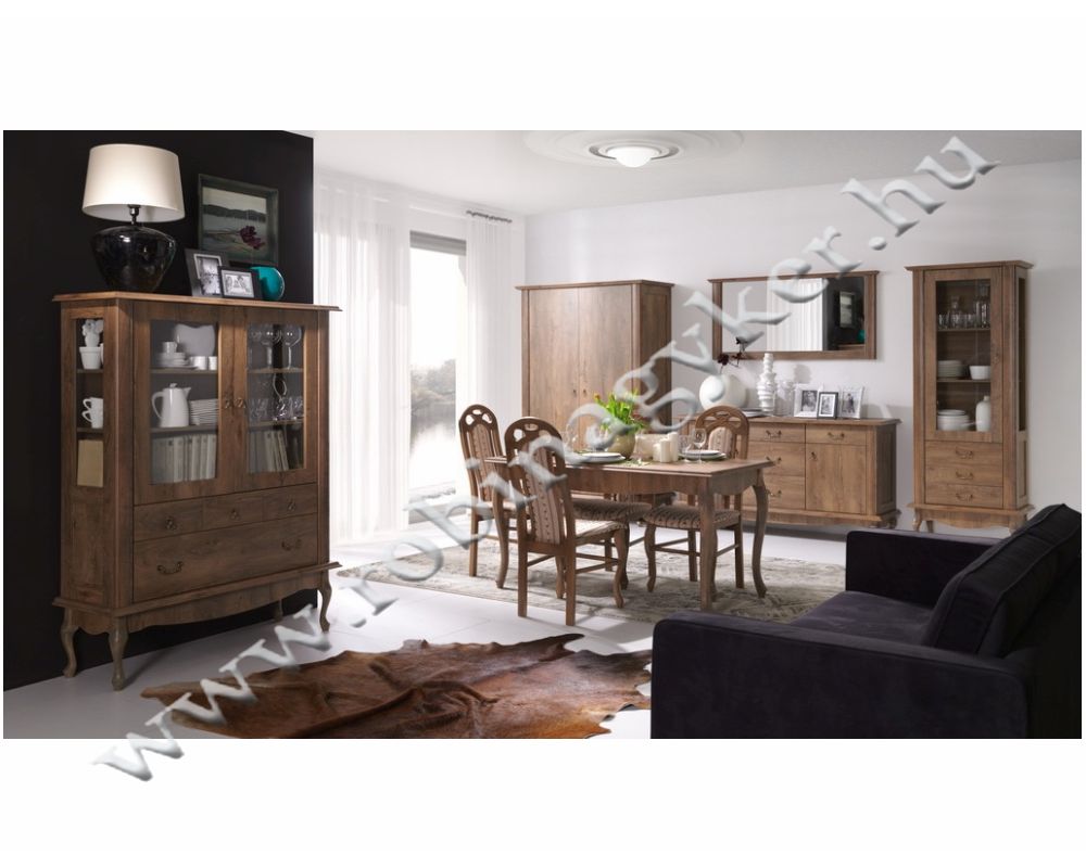 -Elemenként rendelhető Klasszikus stílusú bútor család melynek korpusza laminált 16mm-es faforgácslapból,frontja pedig MDF díszkeretléccel készül.A lábak tömör fából készülnek.