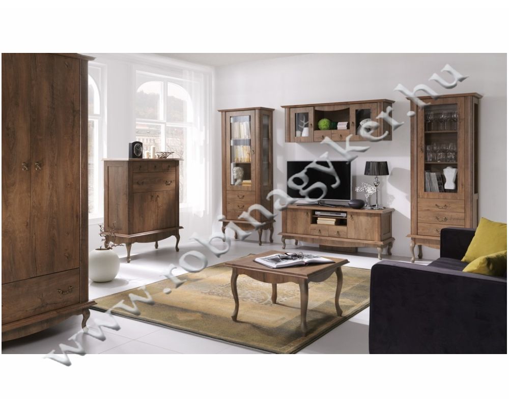 -Elemenként rendelhető Klasszikus stílusú bútor család melynek korpusza laminált 16mm-es faforgácslapból,frontja pedig MDF díszkeretléccel készül.A lábak tömör fából készülnek.