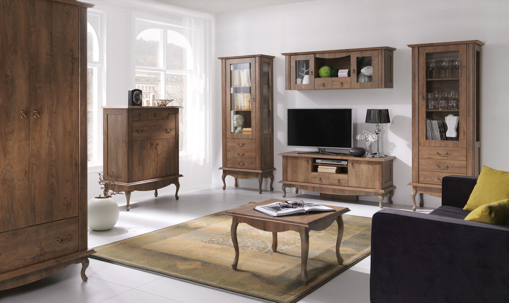 -Elemenként rendelhető Klasszikus stílusú bútor család melynek korpusza laminált 16mm-es faforgácslapból,frontja pedig MDF díszkeretléccel készül.A lábak tömör fából készülnek.