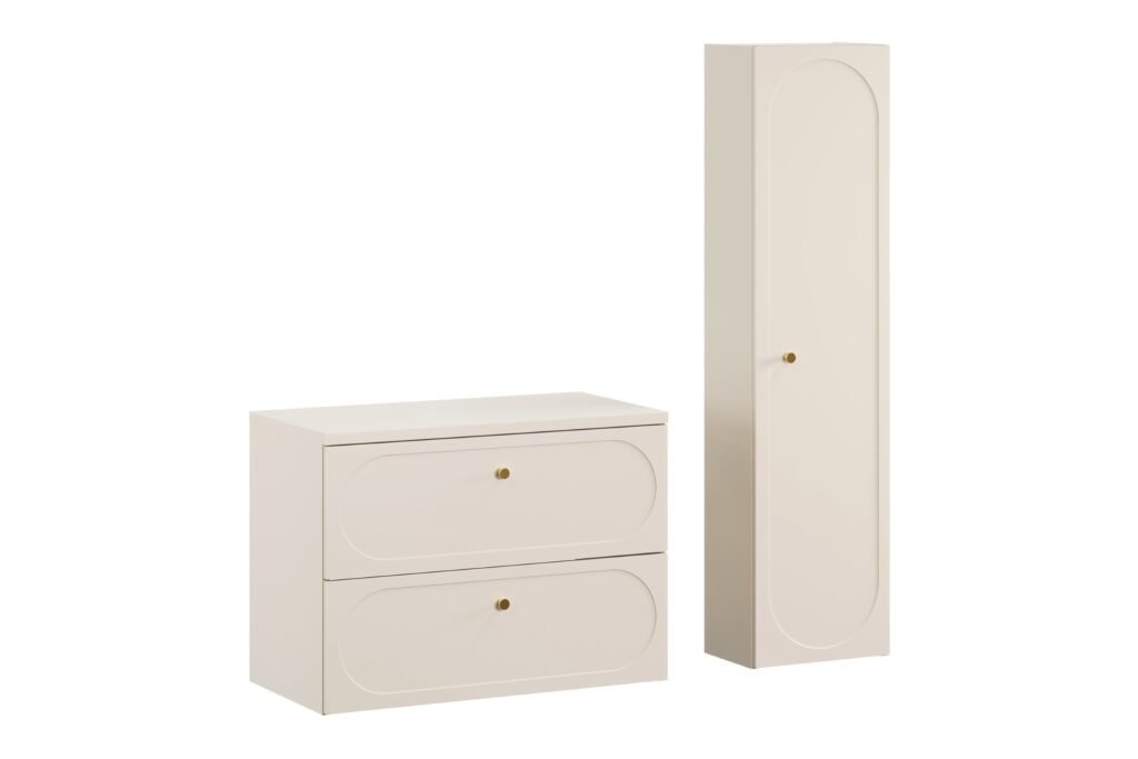 Családi használat esetén praktikus lehet mindenkinek külön fiókot vagy polcot kijelölni. A DONNA SAND 80 cm-es szett és a hozzá illeszkedő magas szekrény könnyen ehhez igazítható: a felső fiók lehet például a felnőtteké, az alsó a gyerekeké, a szekrény polcain pedig kosarakban tárolhatók a személyes holmik. Így a bútor nemcsak esztétikus, hanem kézzelfoghatóan segíti a napi rutinokat is.