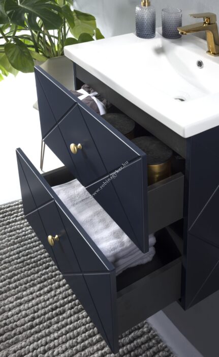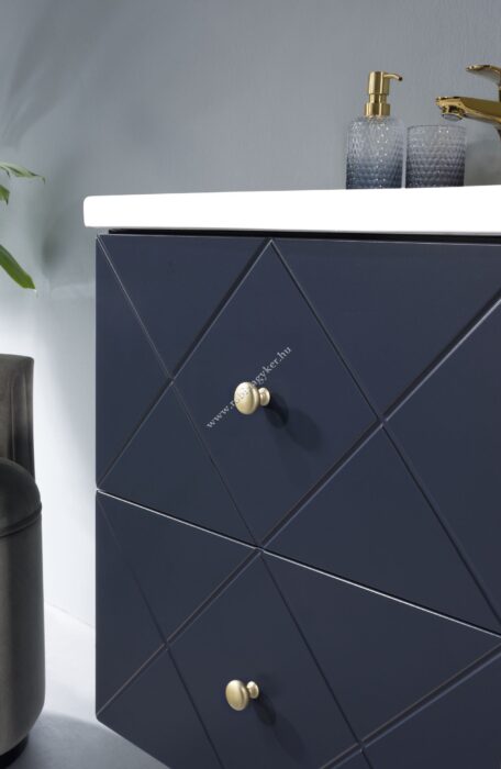 Az Elegance Blue egy olyan kollekció, amelyet az eredeti minta marása és az intenzív kék színárnyalat jellemez, amelyet a tenger mélysége ihletett. A glamour stílus modern változata, amely a gyártói metamorfózison ment keresztül – a modern, divatos szín szálcsiszolt arany fogantyúkkal kombinálva illeszkedik egy modern fürdőszoba elrendezéséhez, miközben stílust, sikket és eleganciát ad neki. Az elegancia a kortárs megoldások egyszerűségét és funkcionalitását, a dekoratív megjelenéssel ötvözi, a magas szekrény belsejében üvegpolcok és felső világítás szolgálja a láthatóságot. A teljes kollekció egy magasra akasztós szekrényből és mosdós szekrényekből áll, három méretben: 60 cm, 90 cm és 120 cm. Ezen kívül tükrök egész sora áll rendelkezésünkre, amelyek tökéletesen kiegészítik az elrendezést.