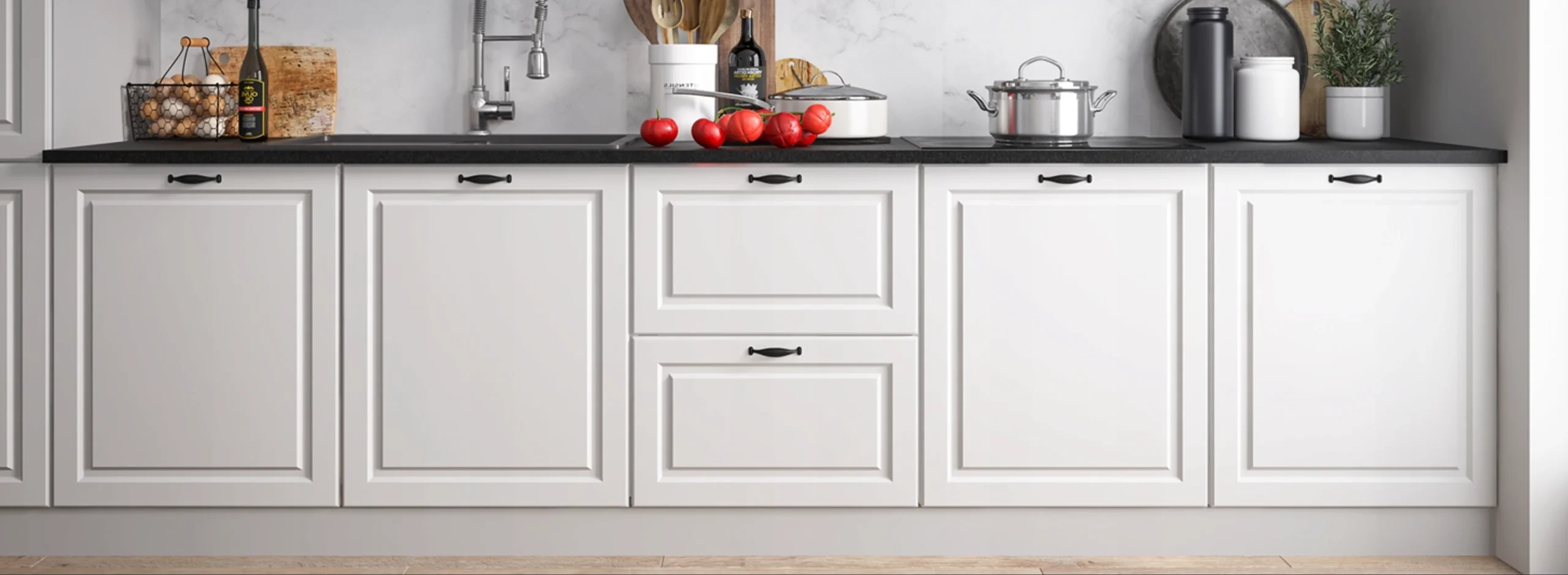 Az EMPORIUM abban is vonzó, hogy a mart keretes front sokkal gazdagabb vizuális hatást ad, mint egy teljesen sík ajtólap, mégsem annyira nehéz vagy túl díszes, hogy csak egyetlen stílusban működjön. A fehér változat letisztult, világos és jól kombinálható natúr fa, fekete, márványhatású vagy világosszürke környezettel. A LIGHT GREY STONE árnyalat finomabb, elegáns, visszafogott tónus, míg a GREY STONE karakteresebb, mélyebb, markánsabb megjelenést ad. A képek alapján ezek a frontszínek különösen szépen mutatnak fa munkalappal, fekete fogantyúval vagy antracit kiegészítőkkel.
