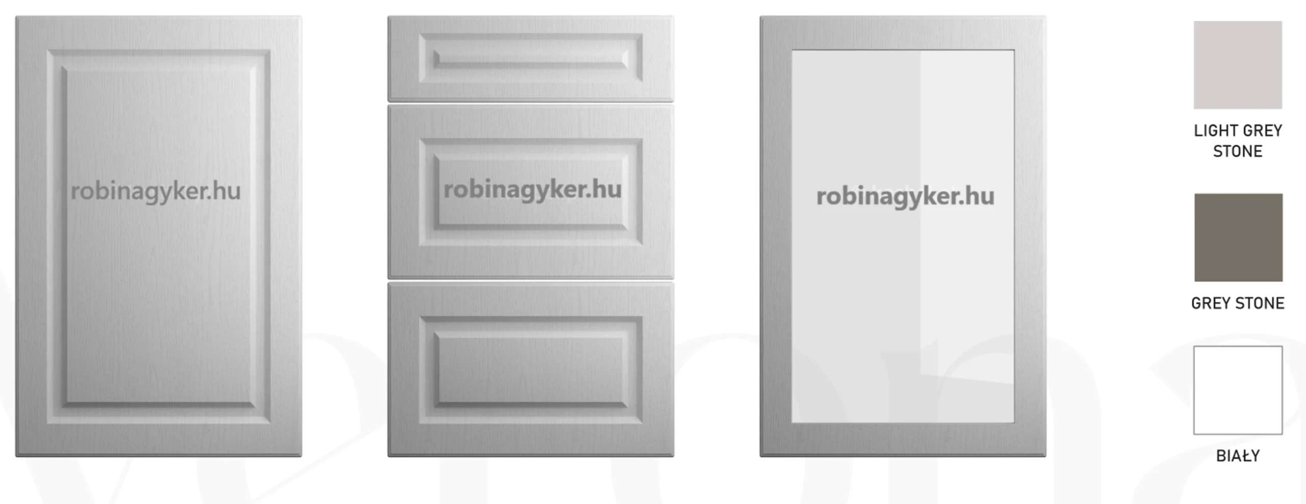 Az EMPORIUM család egyik fő erőssége, hogy egyszerre kínál dekoratív megjelenést és komoly variálhatóságot. A gyártói adatok szerint a front matt PVC fóliás, 16 mm vastag MDF, a korpusz pedig 18 mm vastag lapanyagból készül, öt különböző színben. A frontszínek között GREY STONE, LIGHT GREY STONE és WHITE / BIAŁY szerepelnek, míg a korpuszoknál fehér, grey, lava, dąb artisan és fekete változat érhető el. Ez a kombinációs szabadság különösen fontos akkor, ha nem csupán egy szép bútorra, hanem olyan elemes konyhabútor rendszerre van szükség, amely könnyen illeszthető világos, skandináv, modern klasszikus vagy akár loftos enteriőrökbe is.