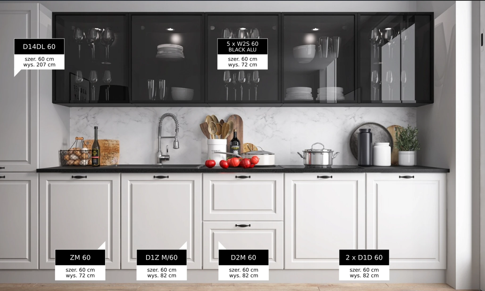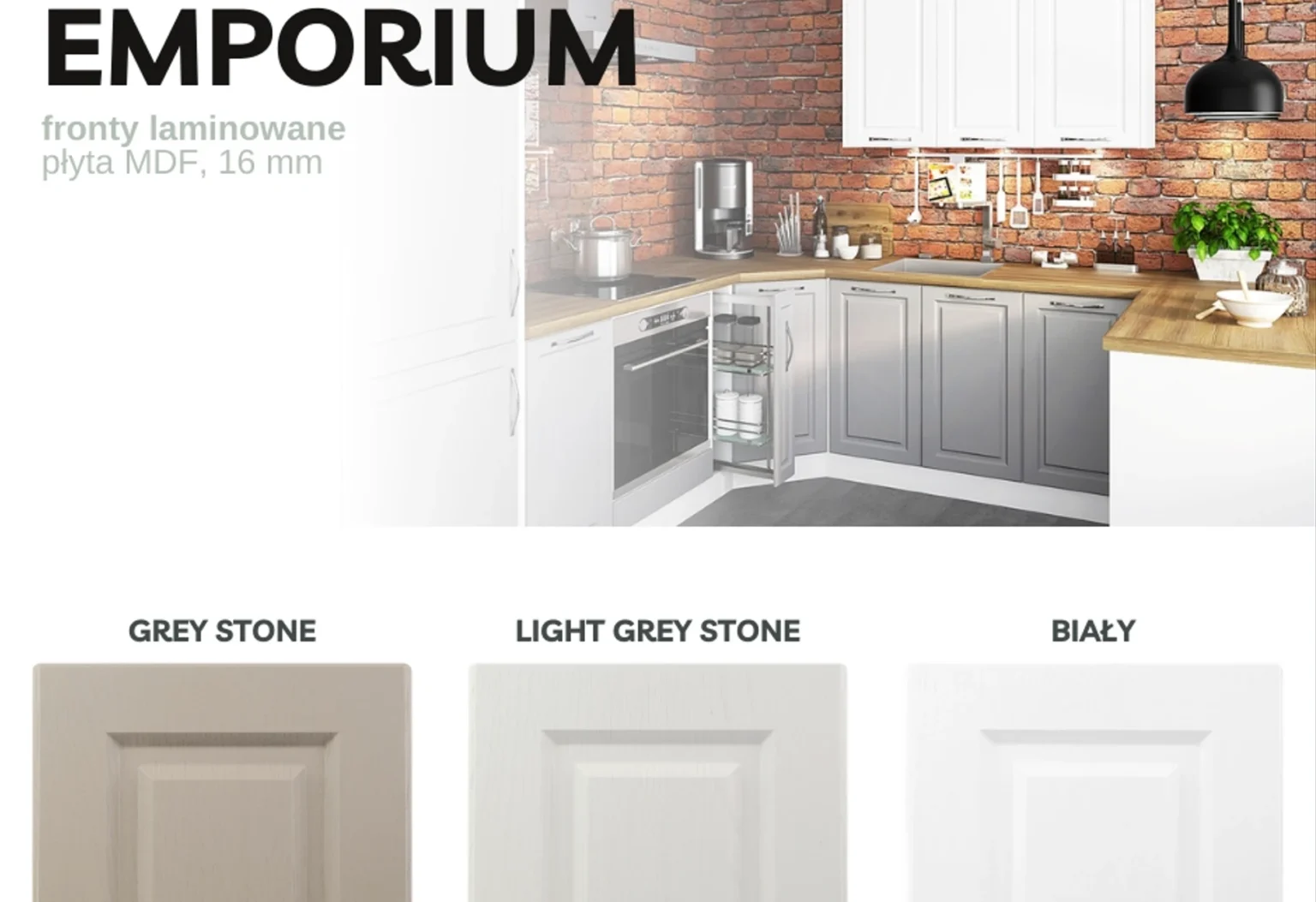 Az EMPORIUM család egyik fő erőssége, hogy egyszerre kínál dekoratív megjelenést és komoly variálhatóságot. A gyártói adatok szerint a front matt PVC fóliás, 16 mm vastag MDF, a korpusz pedig 18 mm vastag lapanyagból készül, öt különböző színben. A frontszínek között GREY STONE, LIGHT GREY STONE és WHITE / BIAŁY szerepelnek, míg a korpuszoknál fehér, grey, lava, dąb artisan és fekete változat érhető el. Ez a kombinációs szabadság különösen fontos akkor, ha nem csupán egy szép bútorra, hanem olyan elemes konyhabútor rendszerre van szükség, amely könnyen illeszthető világos, skandináv, modern klasszikus vagy akár loftos enteriőrökbe is.