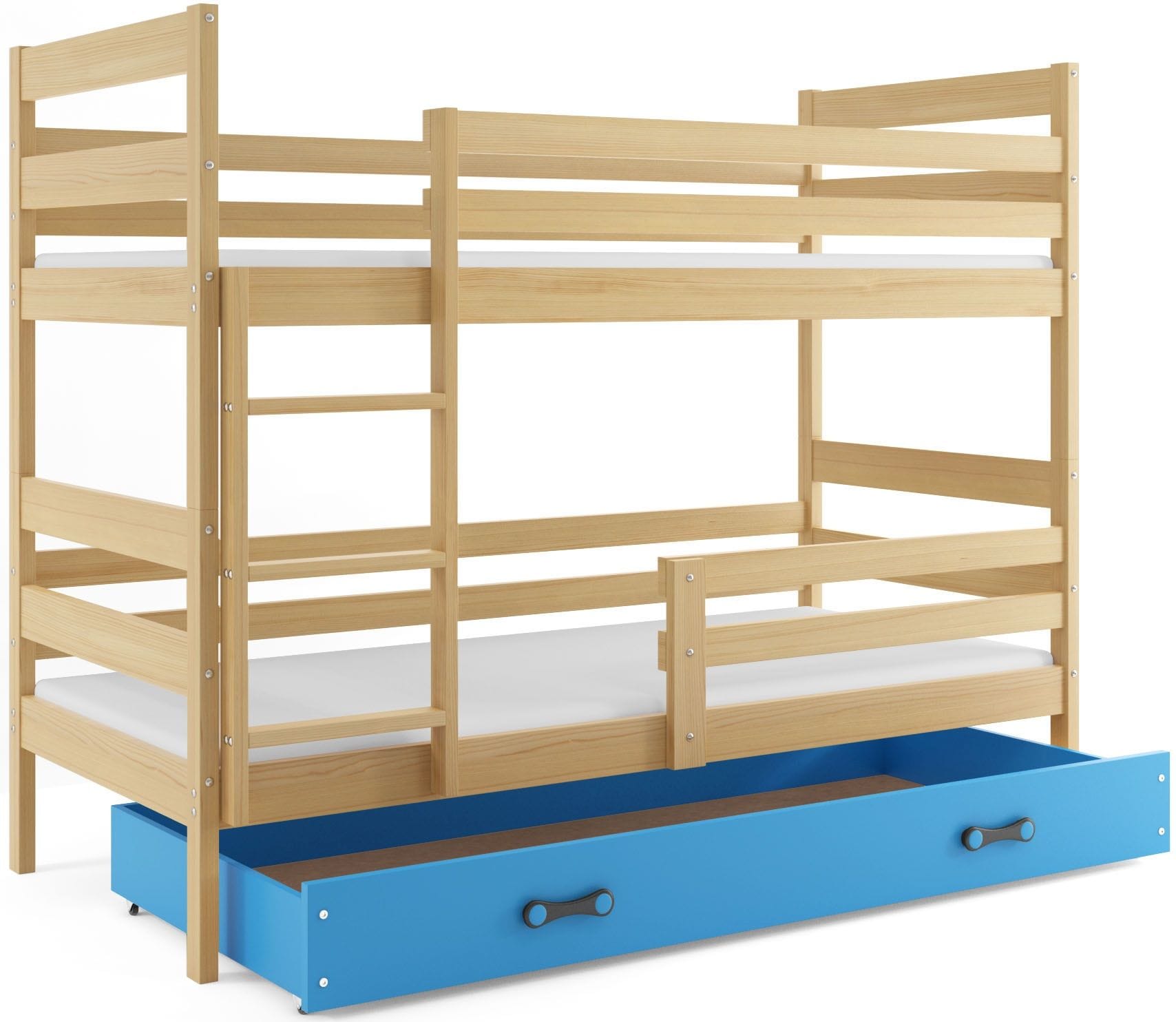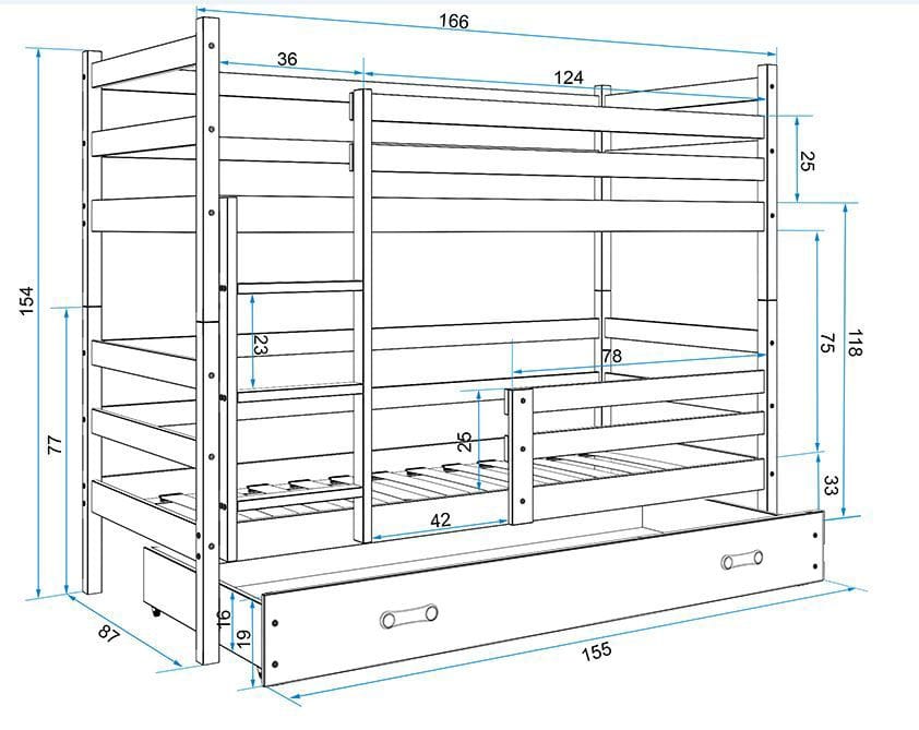 Az ágy stabil, biztonságos és kényelmes fekhelyet biztosít a gyermek számára. Váza minőségi fenyőből készül. Elemeit három réteg festékkel vonják be, mely egészségre ártalmatlan, szagtalan, vízbázisú festék. Az élek lekerekítettek. Az ágy előlapja jobbos illetve balos állásban is felszerelhető, ettől függően az alsó leesés gátló is lehet jobb vagy baloldalon, mely könnyen leszerelhető, ha már nincs rá szükség. A létra is kerülhet jobb illetve bal oldalra is. Az ágyrács lécek bükk fából készülnek. Az ágy alsó részében könnyen hozzáférhető, kerekeken gördülő fiók található.