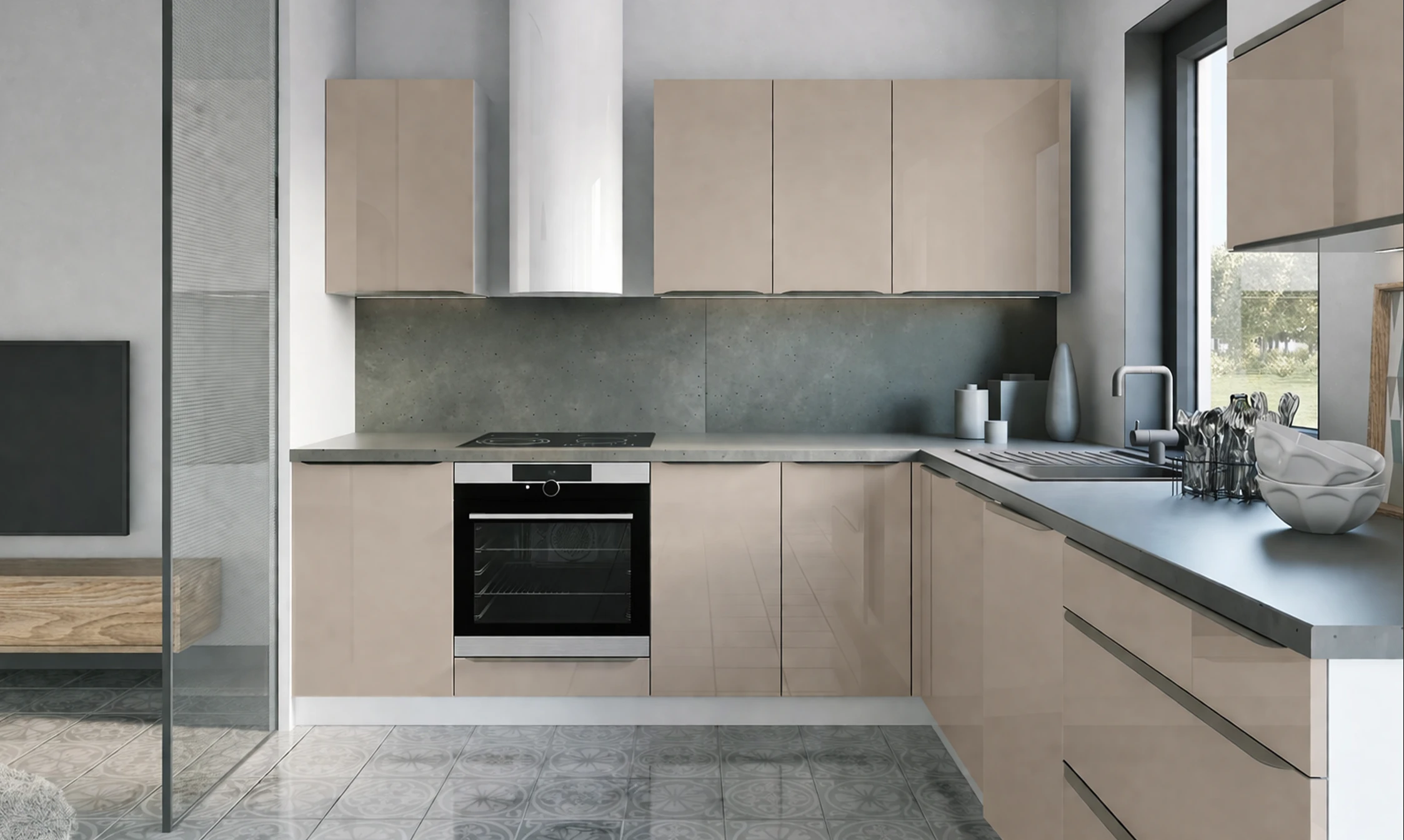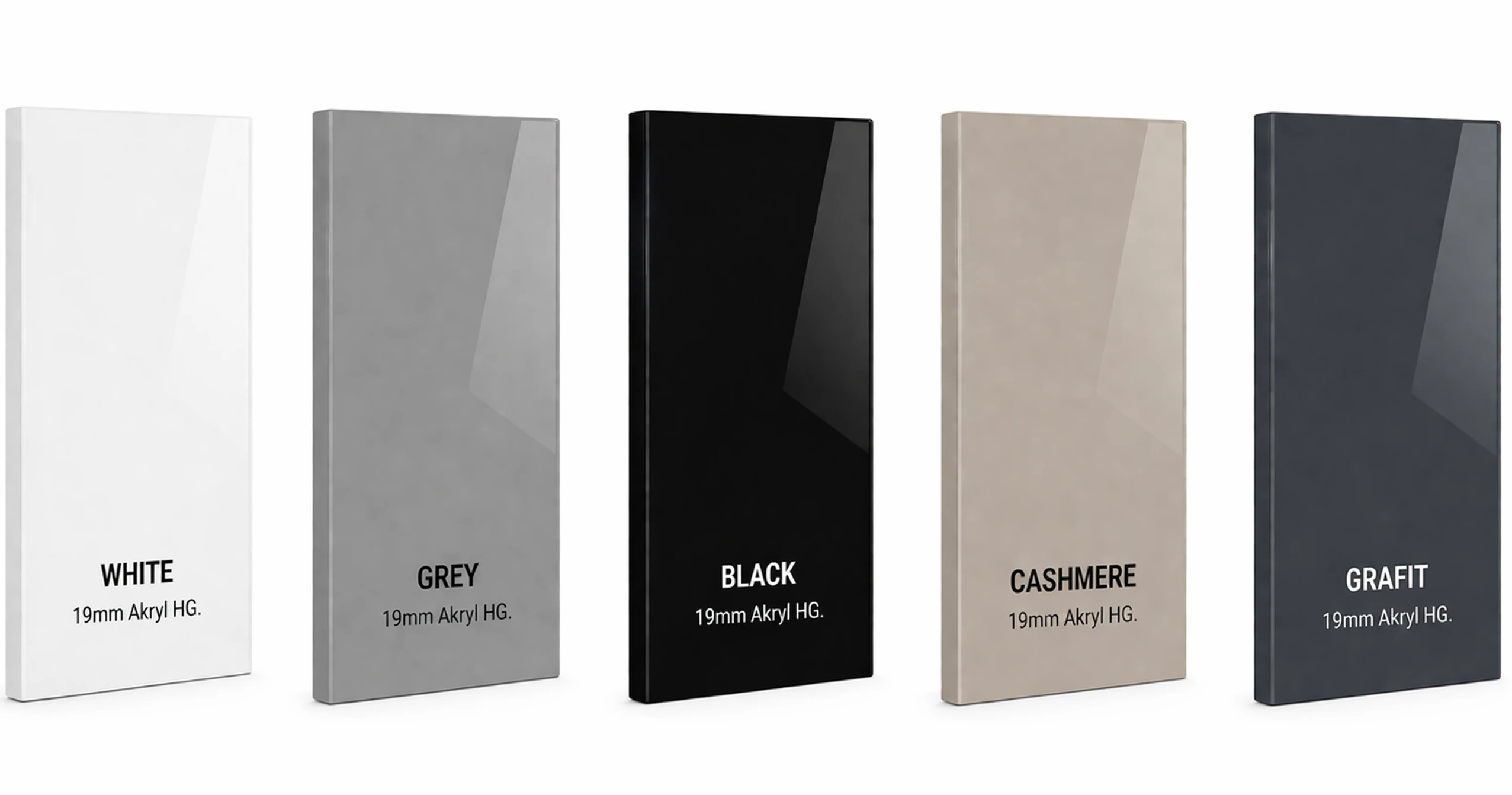 Az ESSEN egyik legfontosabb ismertetőjele a magasfényű akril front. A gyártói adatlap szerint a front akril fényes, 19 mm vastagságú, és ez a frontanyag egyszerre ad modern, üvegszerű hatást és stabil, merev szerkezetet. A magasfényű felület különösen népszerű a modern konyhabútor kategóriában, mert a fényt szépen visszaveri, a tér világosabbnak és rendezettebbnek érződik tőle, és a nagy, egységes síkok vizuálisan elegánsabbá teszik az egész helyiséget.